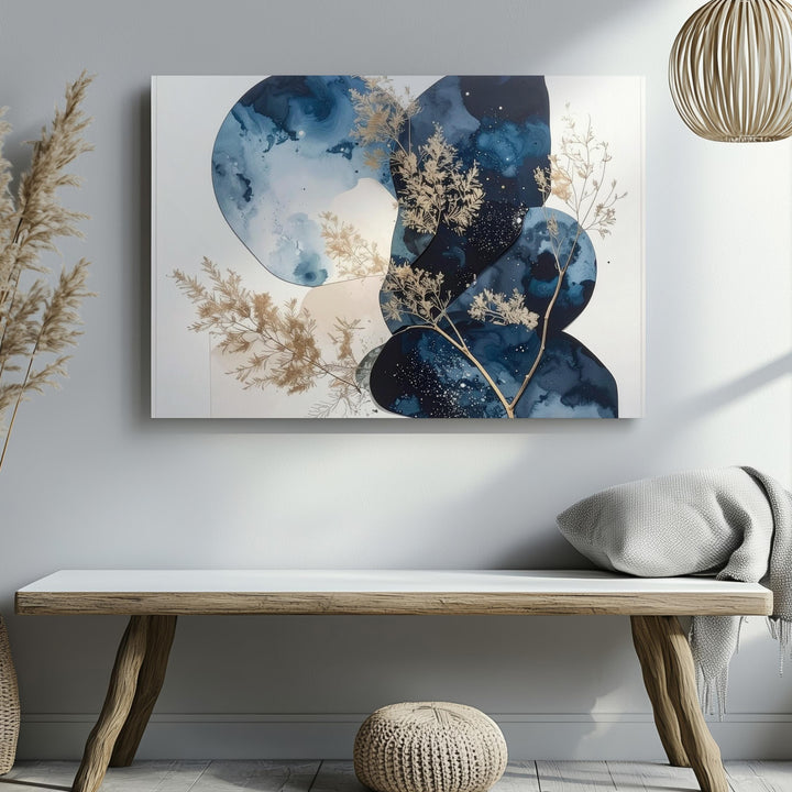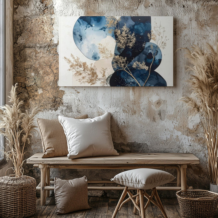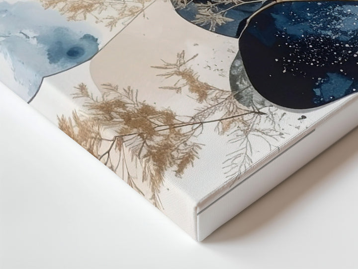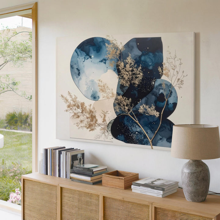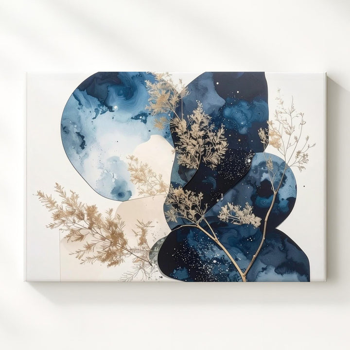 This abstract collage canvas layers watercolor-textured shapes in navy, indigo, and pale blue with delicate beige botanical branches that resemble dried twigs. Star-like speckles add a cosmic touch to the vertical composition, guiding the eye gently downward through a harmonious blend of depth and light. The clean white background and subtle gradients create a peaceful, modern ambiance—ideal for spaces seeking serene sophistication.