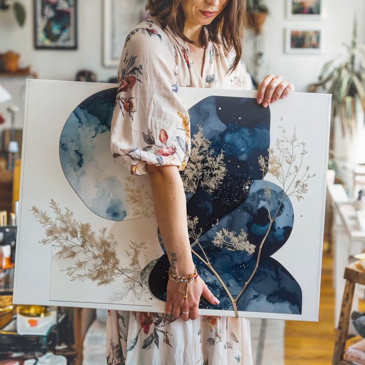 Nocturnal Bloom Abstract Canvas – Layered Indigo Shapes & Botanical Art