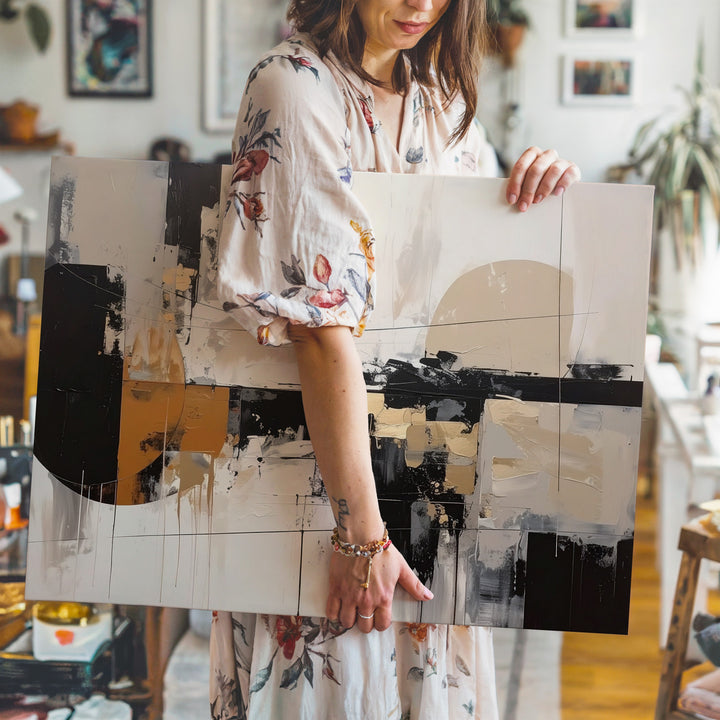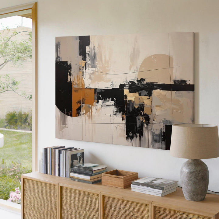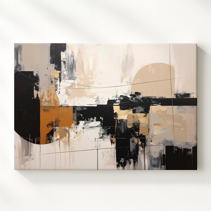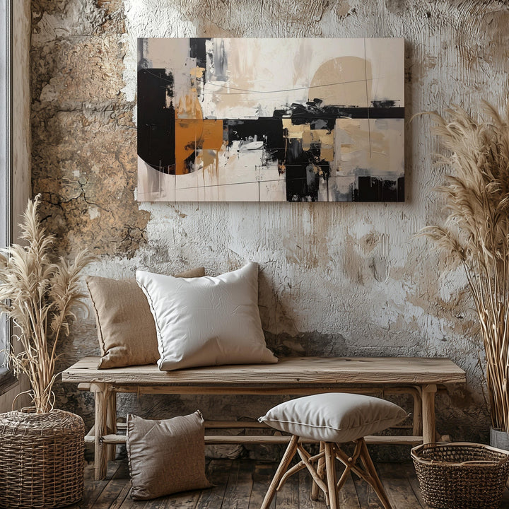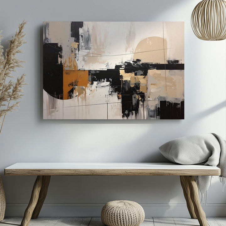 This mixed-media abstract canvas blends soft beige washes with bold ochre semicircles and textured black blocks. Asymmetrical composition and delicate intersecting lines create movement and structure, while smudged brushwork adds an unfinished, organic feel. The warm neutrals and graphic contrasts evoke a modern aesthetic—perfect for contemporary interiors embracing subtle complexity and minimalism.