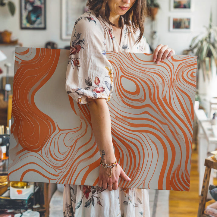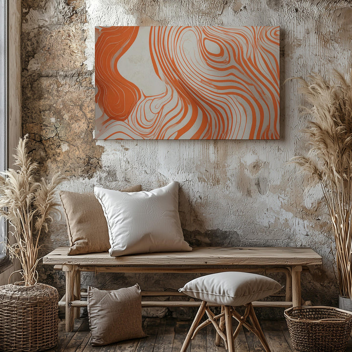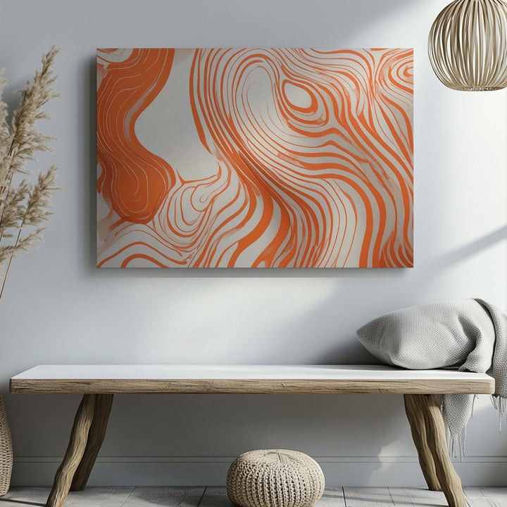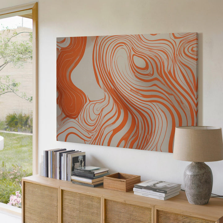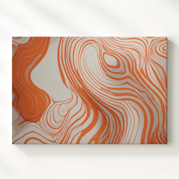 This contemporary line art canvas features flowing, vibrant orange lines dancing gracefully across a soft cream background. Reminiscent of natural contours and topographic landscapes, its organic curves and smooth, interconnected paths evoke calm fluidity and warmth—perfectly complementing minimalist interiors craving an inviting touch of modern simplicity.