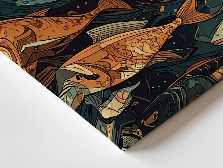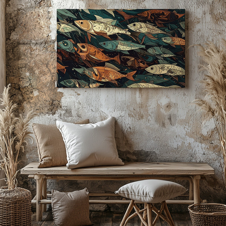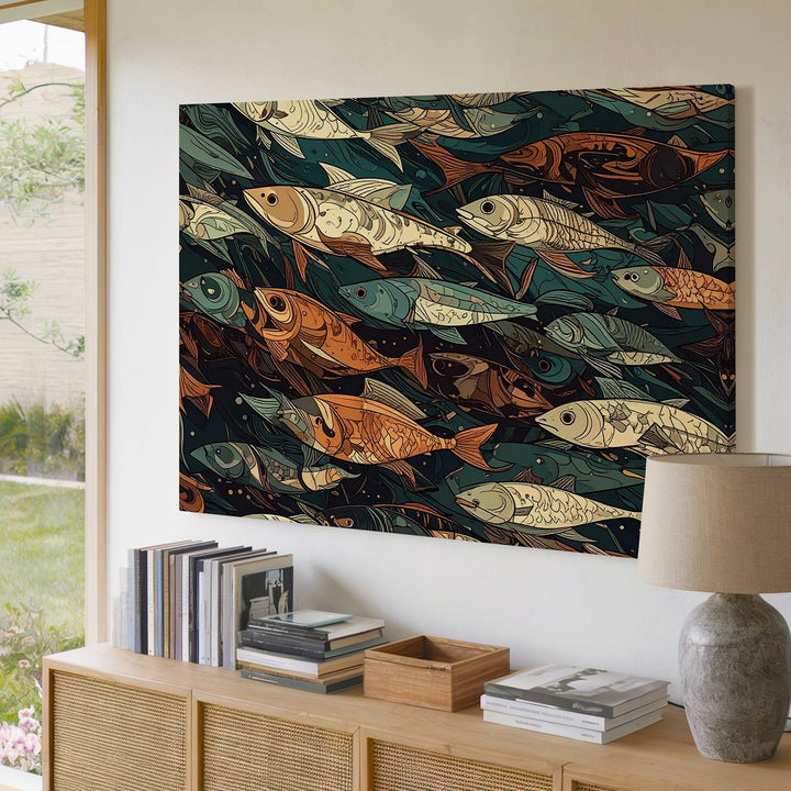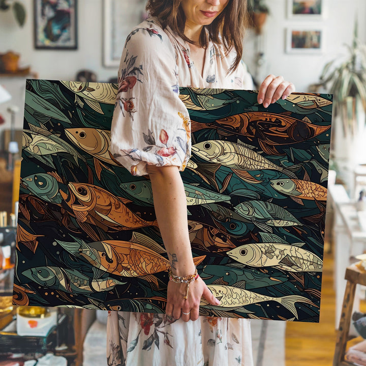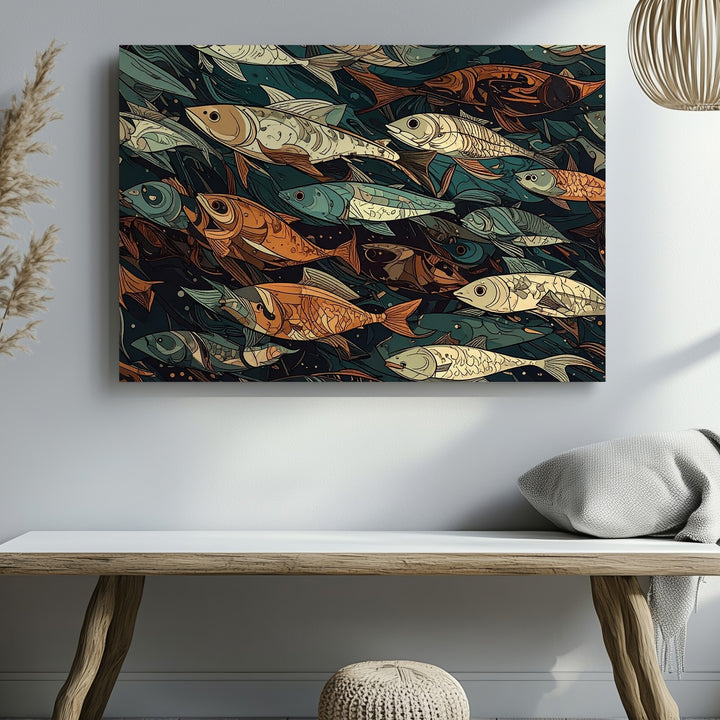 This decorative canvas showcases a vertical pattern of stylized fish swimming in alternating directions. Rendered with minimalist linework and graphic shapes in muted navy blue, teal, beige, and copper, each fish features folk-art-inspired stripes, dots, and waves. Set against a rich dark teal background, the dense, rhythmic composition creates a seamless ornamental design full of movement, repetition, and elegant symmetry—perfect for lovers of marine motifs and artisanal style.