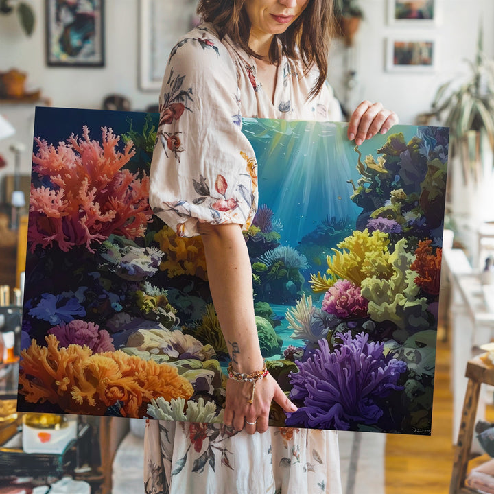 This richly painted canvas captures a colorful coral reef in full flourish, layered with shades of soft red, orange, vivid yellow, magenta, purple, and lush green. Viewed at an angle, the reef unfolds like a living tapestry, with shafts of light illuminating coral heads and plant-like forms that fill the gaps between. The brushwork brings both texture and a touch of storybook magic, blending realistic detail with artistic wonder in a scene that feels alive, radiant, and timeless.