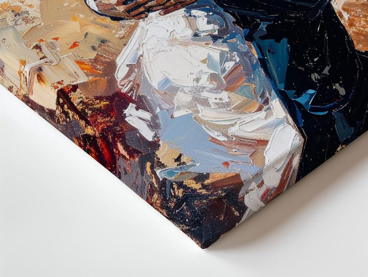 * Textured Background: The bold brushstrokes in earthy tones provide contrast, enhancing the emotional depth and vibrancy of the scene.