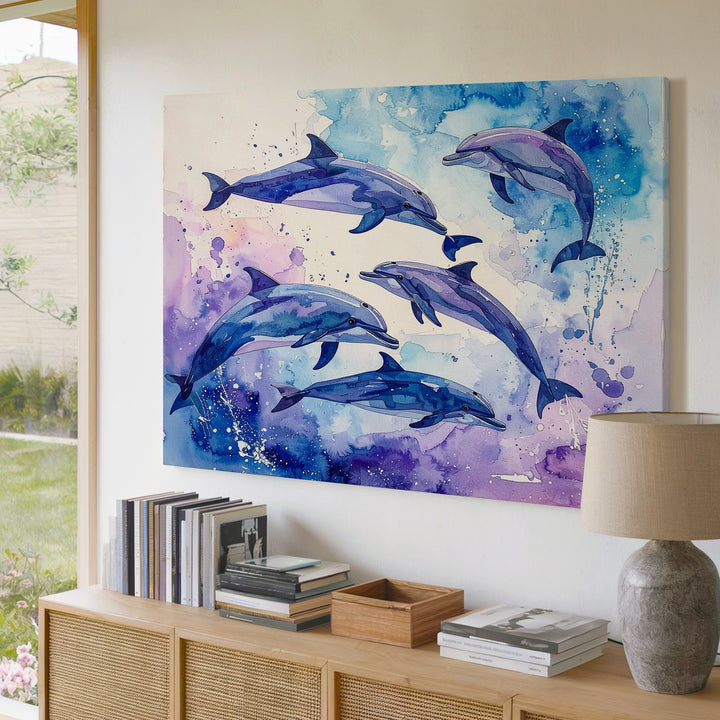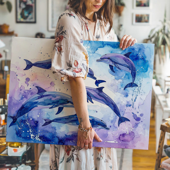 This delicate watercolor canvas features dolphins sketching joyous arcs across a soft pastel sky of blues, purples, and pinks. Their loose ink outlines and minimal shading convey effortless motion and whimsy, while gentle splashes and bubbles float around, enhancing the dreamy, airy scene. A visual poem of playful elegance, this artwork brightens spaces with uplifting marine spirit and lighthearted beauty.