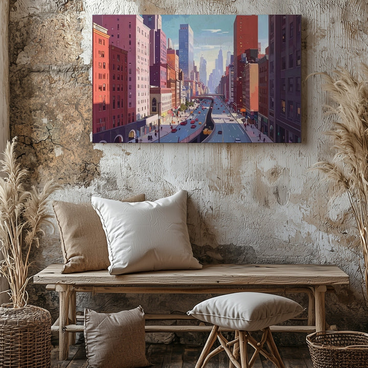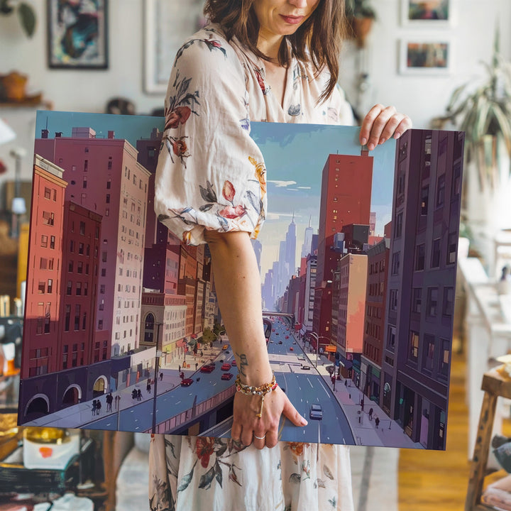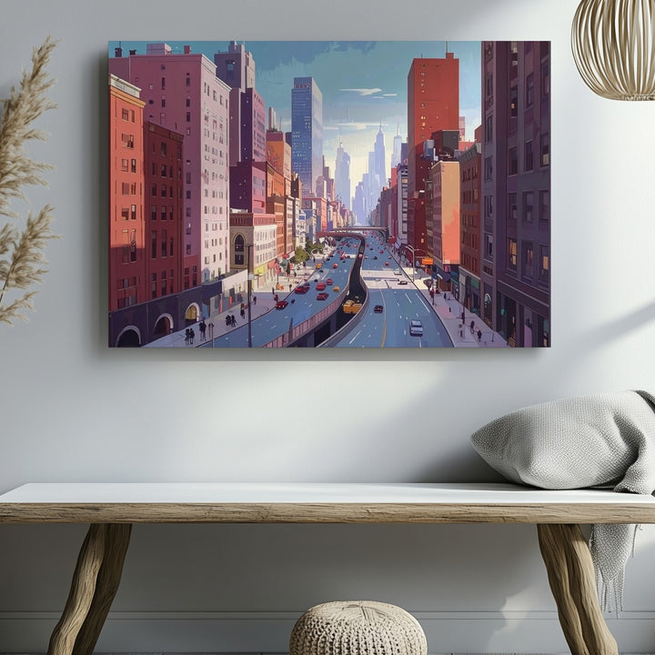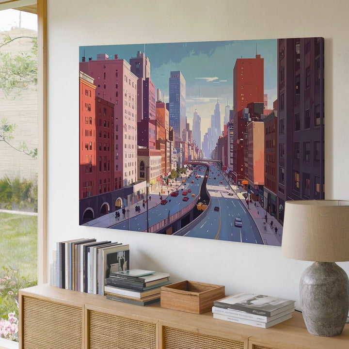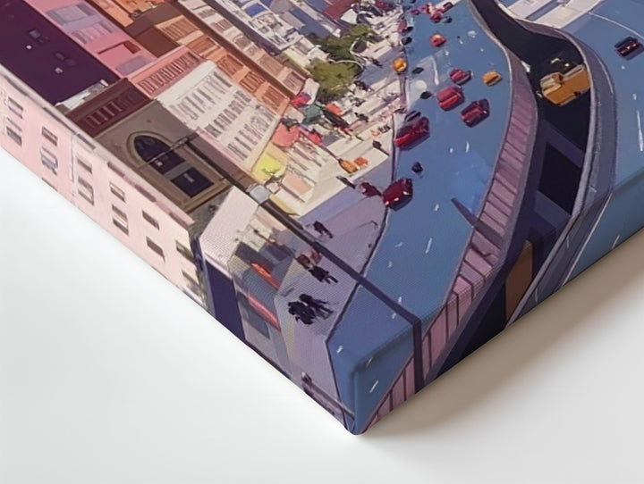 Pastel Future City Canvas – Surreal Utopian Highway Scene Wall Art