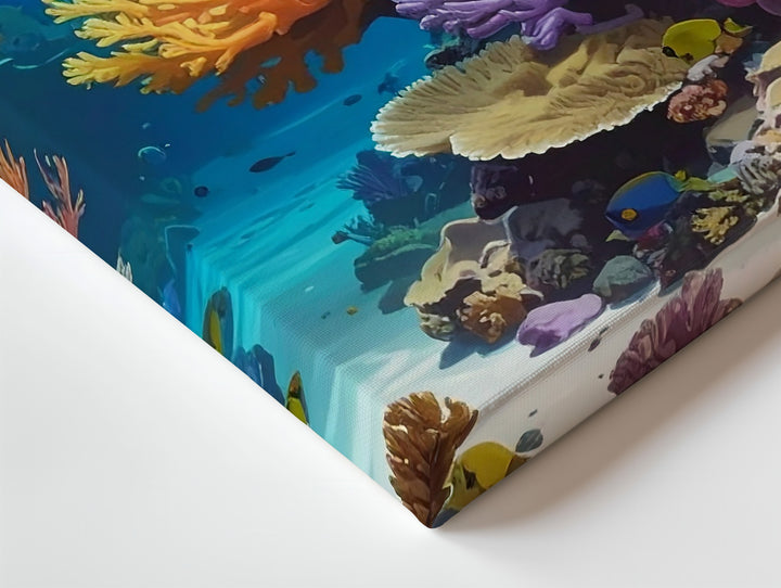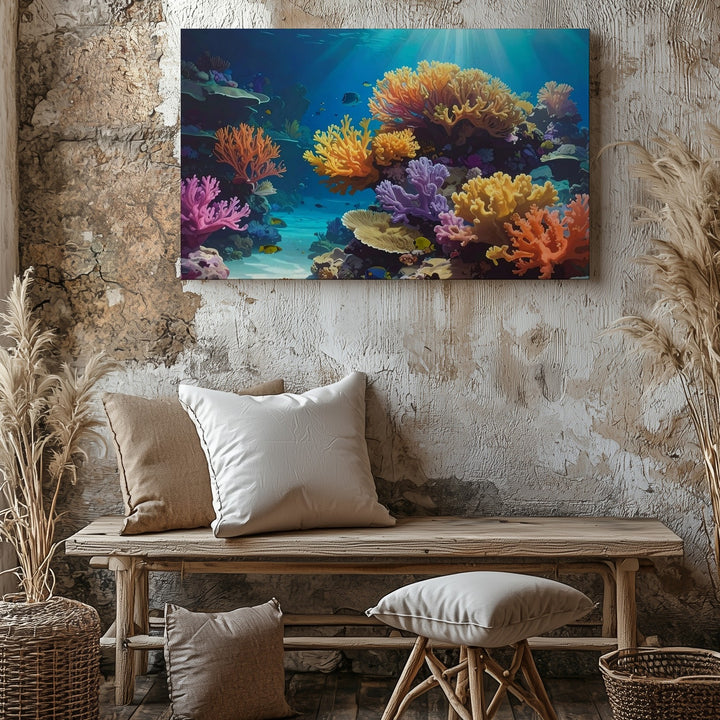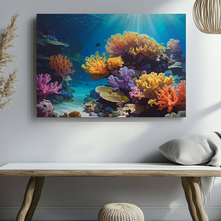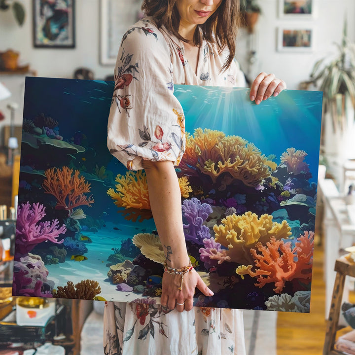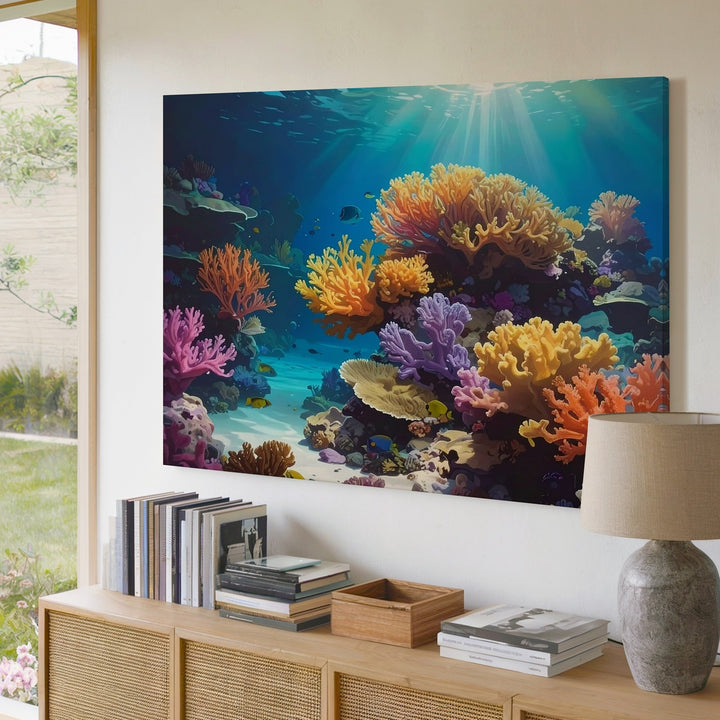 This stunning photorealistic canvas immerses you in a vibrant coral reef illuminated by dappled sunlight. Every detail—from the textured orange, yellow, pink, and lavender corals to the shimmering fish darting through the reef—captures the richness and balance of a thriving underwater world. Blue-green waters add clarity and depth, while sunbeams flicker across rocky surfaces, celebrating the magic of nature’s most colorful sanctuary.