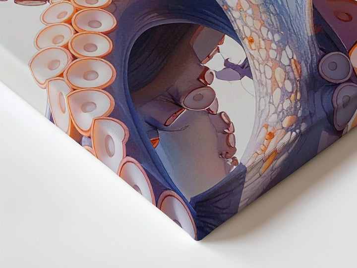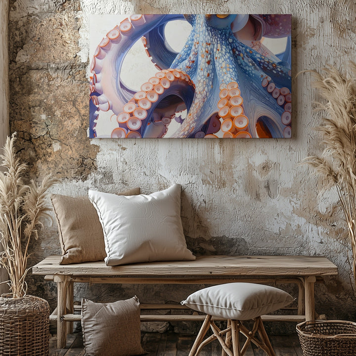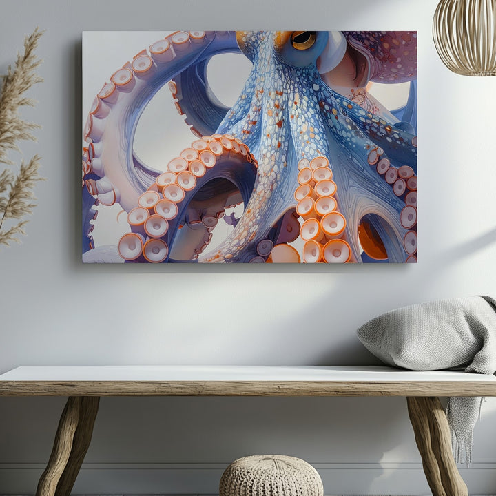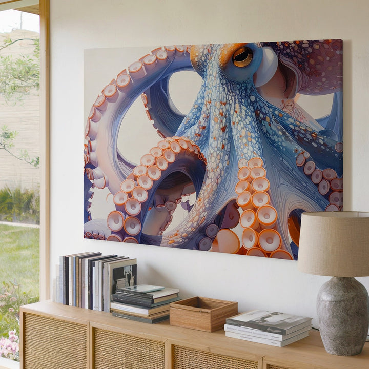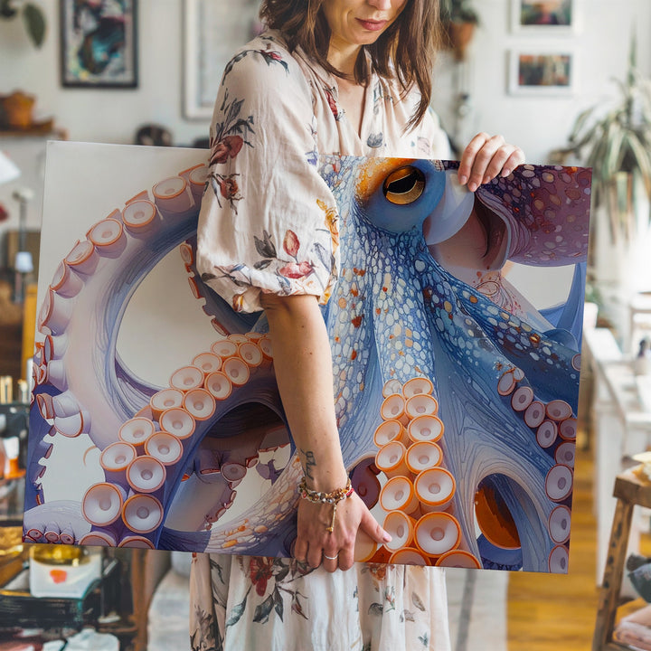 This photorealistic 3D-rendered canvas features a striking blue octopus with subtle purple shading and distinctive orange-ringed suction cups. Its tactile skin textures, smooth reflections, and intricate folds bring the creature vividly to life. One glossy, expressive eye gazes outward, capturing curiosity and presence. Set against a crisp white background, the composition emphasizes clarity, dimensionality, and a sleek, futuristic marine aesthetic.