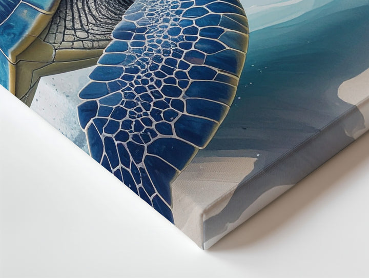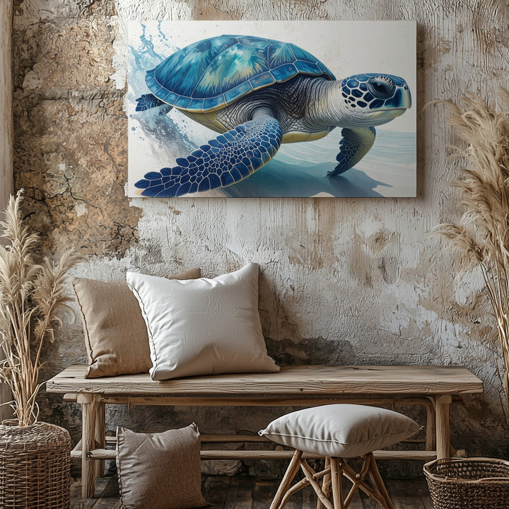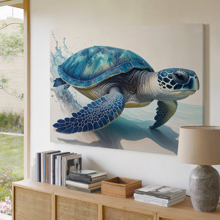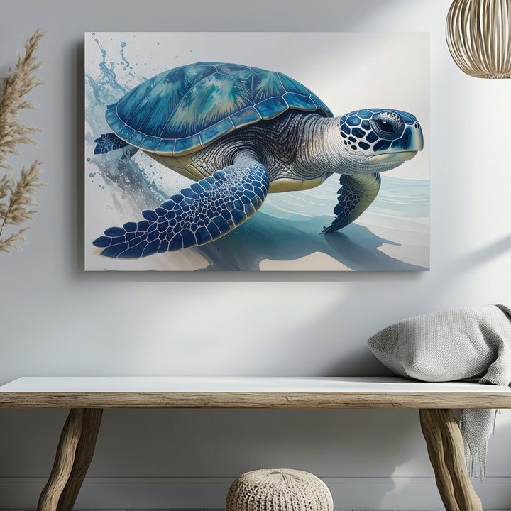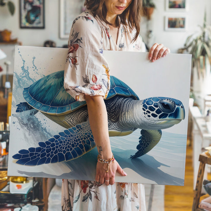 This stunning photorealistic canvas portrays a sea turtle swimming gracefully toward the right in shallow waters. Its shell gleams with rich blues and teals, highlighted by natural patterns and textures, while lifelike flippers suggest motion with delicate water splashes. Set against a soft, minimal gradient background, the turtle commands attention with serene elegance—an intimate, focused portrait celebrating the beauty and strength of marine life.