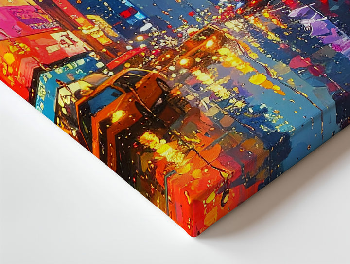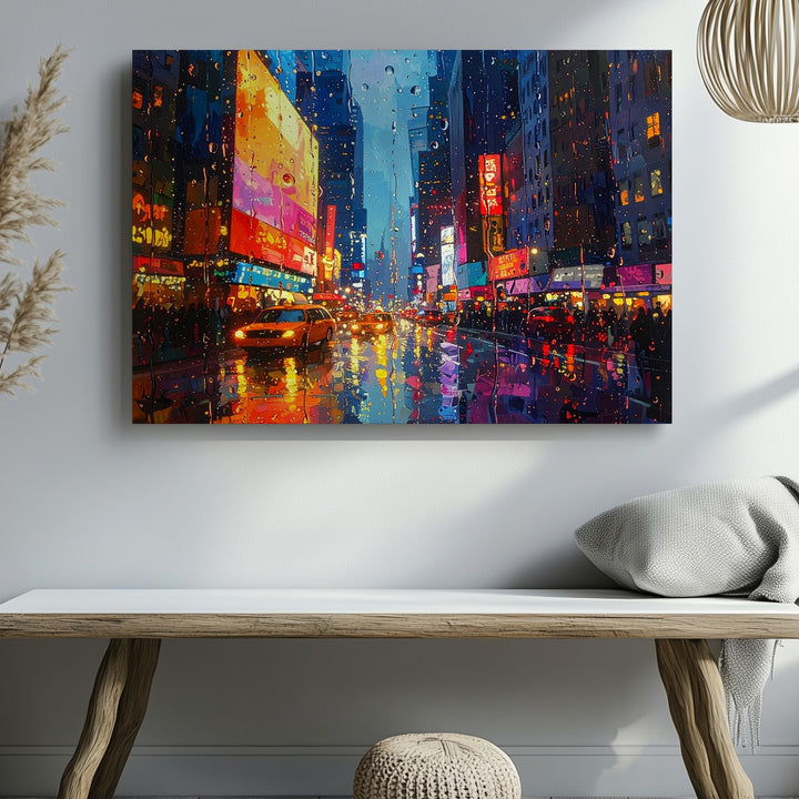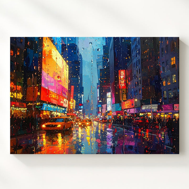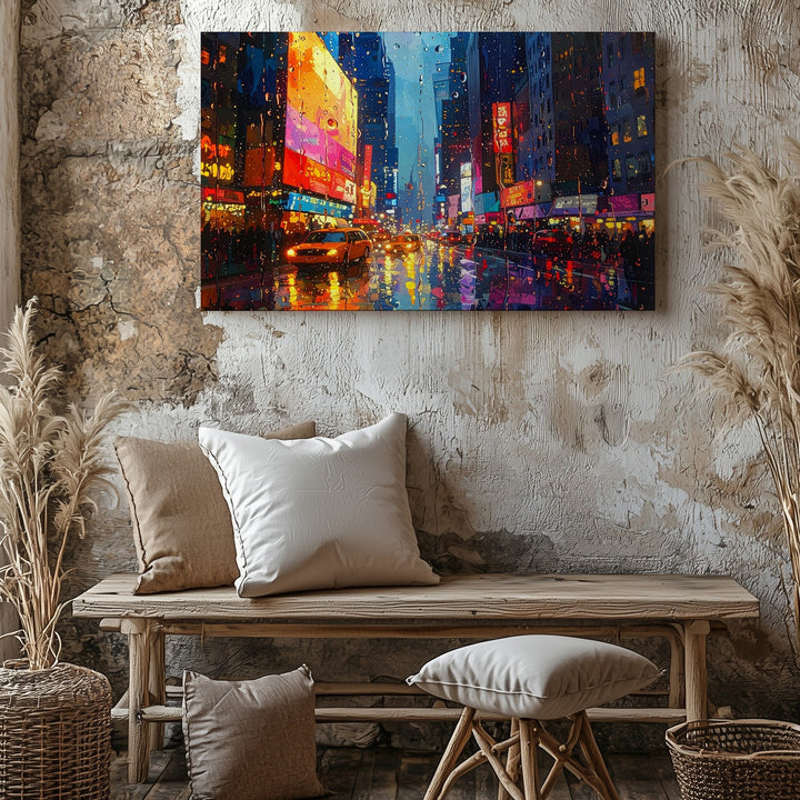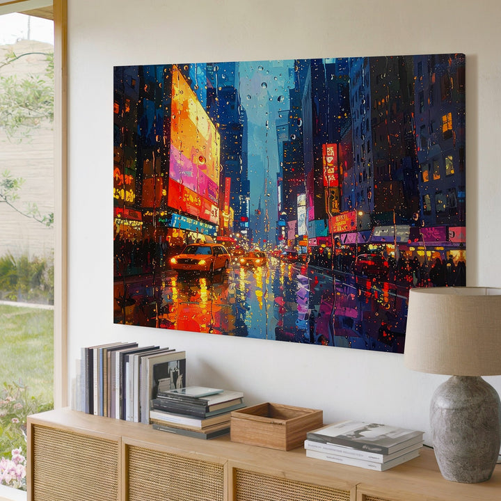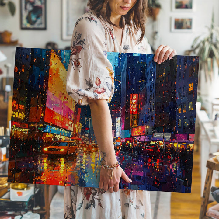 This evocative canvas captures the emotional stillness of watching a neon-lit city pulse through raindrop-covered glass. With painterly texture and blurred brilliance, glowing billboards, headlights, and signage melt into rich blues, oranges, and pinks. The wet street below becomes a canvas of its own, reflecting the city’s motion and mood in liquid light. A tribute to rainy nights, quiet observation, and the poetry of distance.