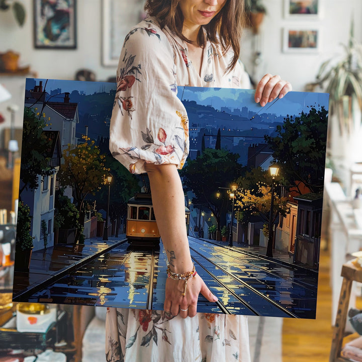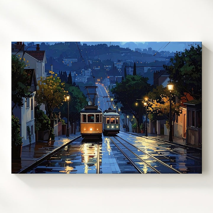 This tranquil canvas captures a contemplative moment on a rainy hillside street, where two vintage trams ascend beneath soft lamplight and glistening reflections. Wet cobblestones shimmer with golden hues, while tree-lined homes and a twilight sky wrap the neighborhood in quiet comfort. Each brushstroke echoes the hush of nightfall and the beauty of simple movement through mist and memory.