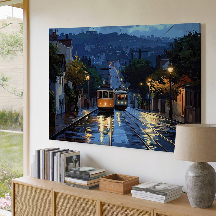 Rainy Tram Evening Canvas – Peaceful Urban Hillside Wall Art