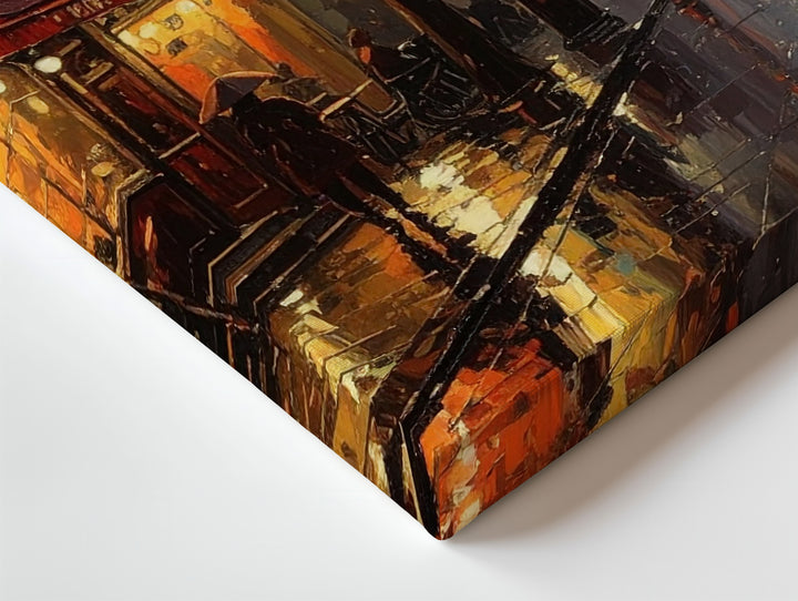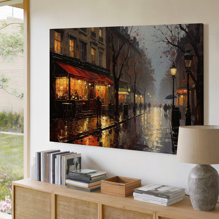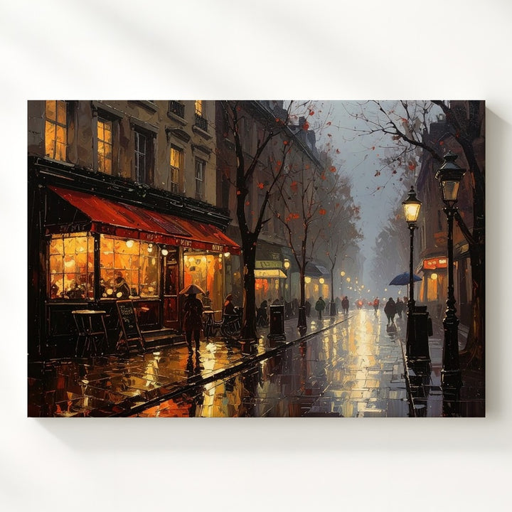 This evocative canvas captures the soul of Paris on a rainy evening, where golden café lights dance across glistening cobblestones and quiet figures linger beneath umbrellas. A red awning glows like a heartbeat in the mist, while bare trees and hazy windows stretch into the distance. Soft rain blurs the edges of the night, turning every shadow into poetry and every reflection into memory.