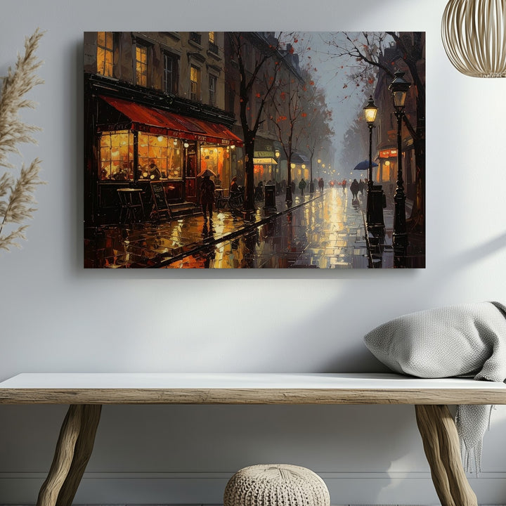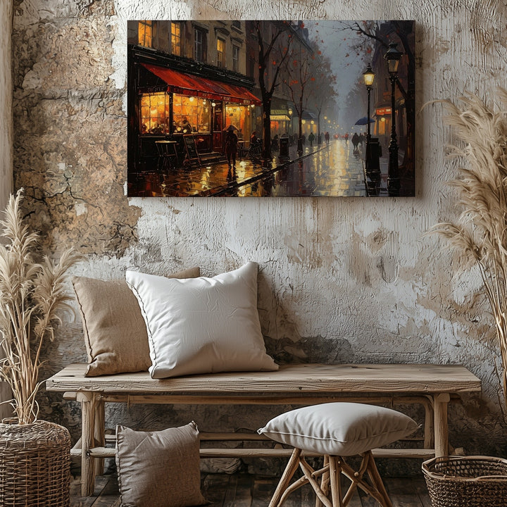 Rainy Evening in Paris Canvas – Romantic Café Street Scene Wall Art