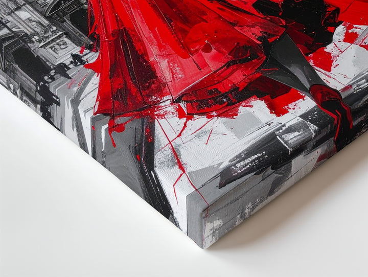 This striking canvas features a stylized black-and-white sketch of a confident woman in a flowing red dress and wide-brimmed hat, walking gracefully toward the grandeur of a Gothic cathedral, likely the iconic Milan Cathedral. The vivid red of her dress pops against the monochrome background, capturing both motion and elegance in a single moment. The detailed cathedral behind her adds depth and context, creating a perfect balance of classic beauty and modern fashion-forward design. Ideal for those who appreciate art that blends timeless style with contemporary flair.