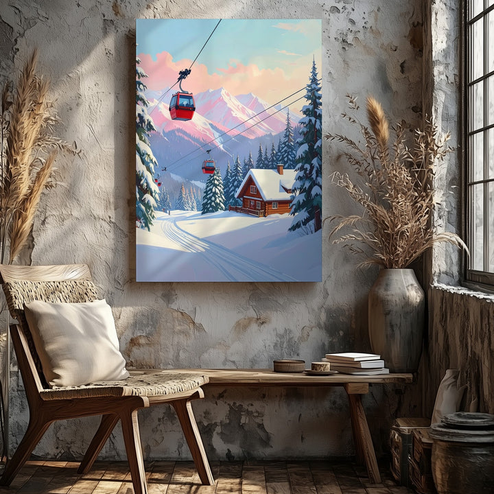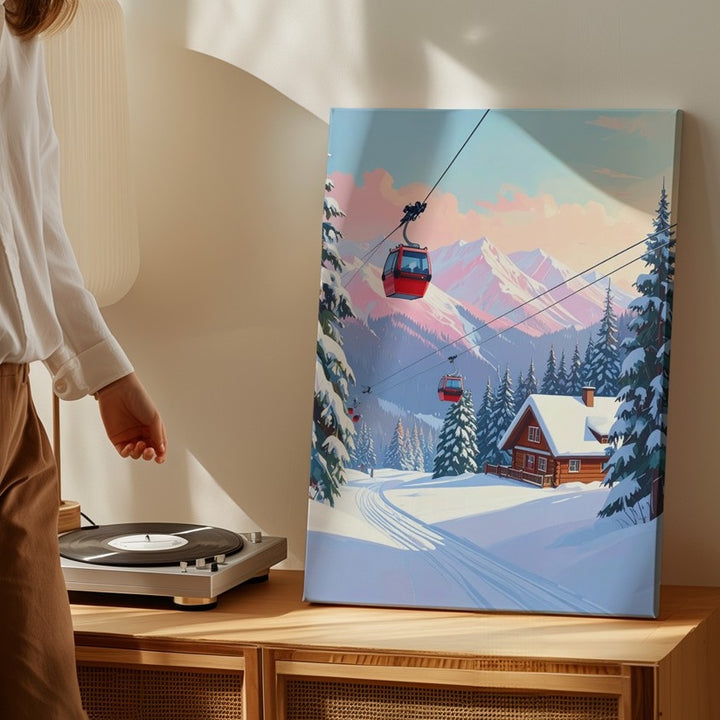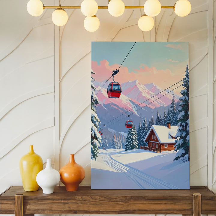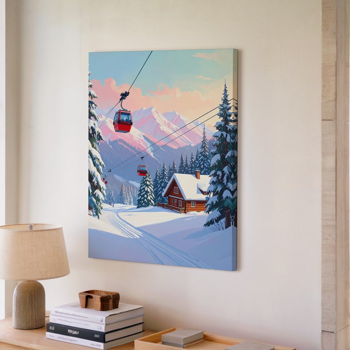 This charming canvas depicts two red gondola cable cars gliding gracefully above soft pastel snow-covered mountains. Nestled among tall, snow-dusted pines, a cozy wooden cabin adds warmth to the serene landscape. The sky’s gradient from peach to pale blue mirrors the tender glow of morning or evening light, inviting a peaceful escape into the rhythm of winter mountain life.