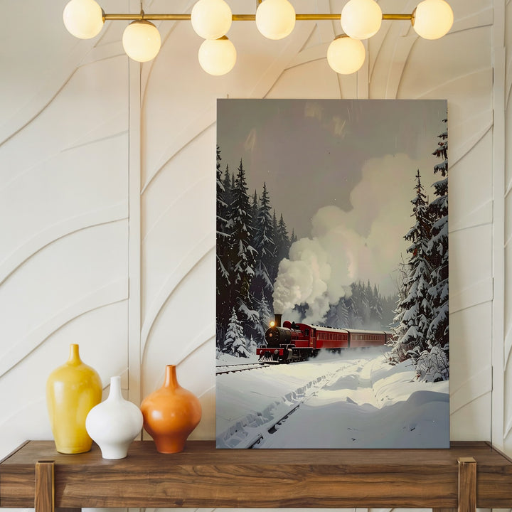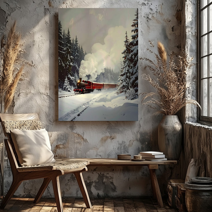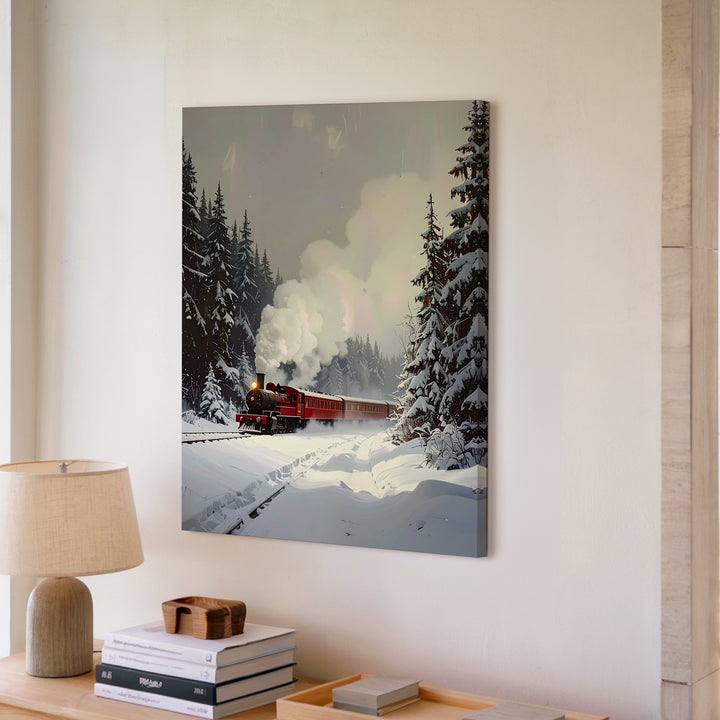 Nostalgic Red Locomotive Winter Train Canvas – Serene Snowy Forest Art