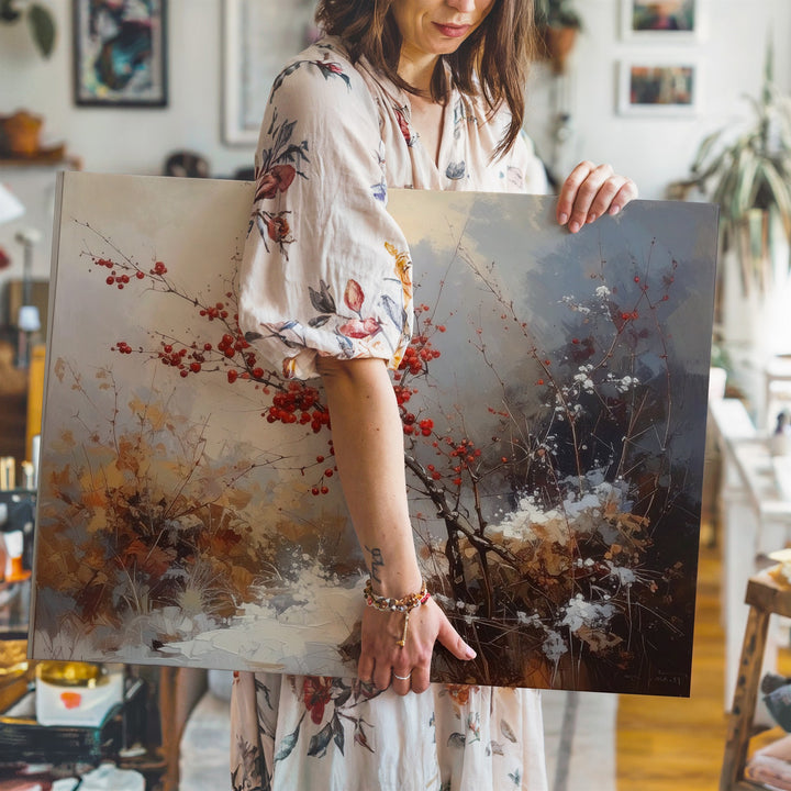 This poetic winter canvas captures the fragile beauty of bright red berries clinging to slender frost-dusted branches. Set against a soft, abstract background of off-whites, misty grays, and muted blues, the composition feels like a whispered meditation on resilience. The delicate watercolor texture brings gentle motion to the stillness—inviting the viewer to pause, reflect, and embrace the quiet grace of nature in winter.