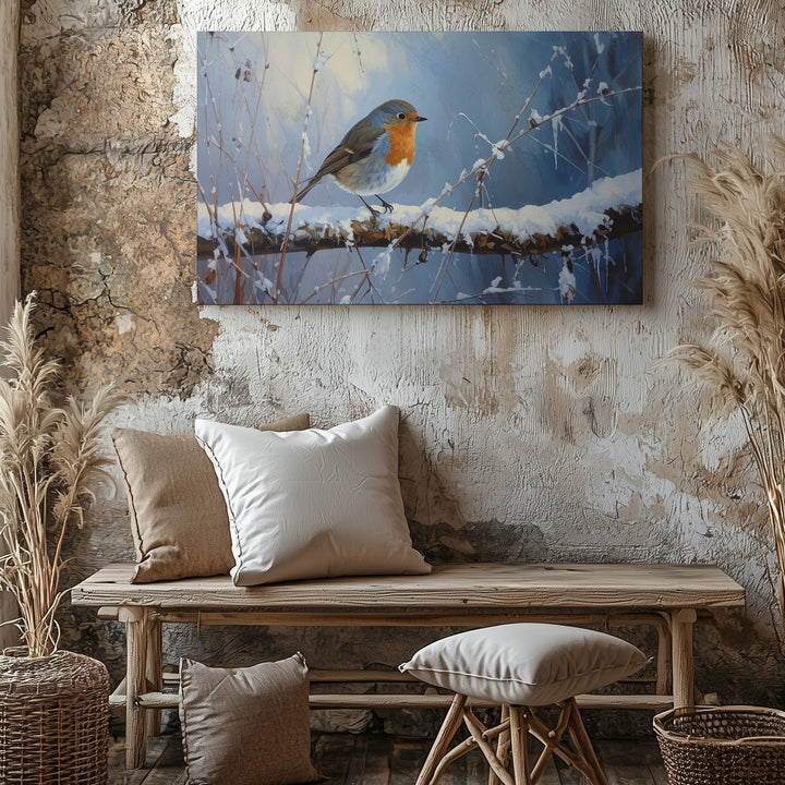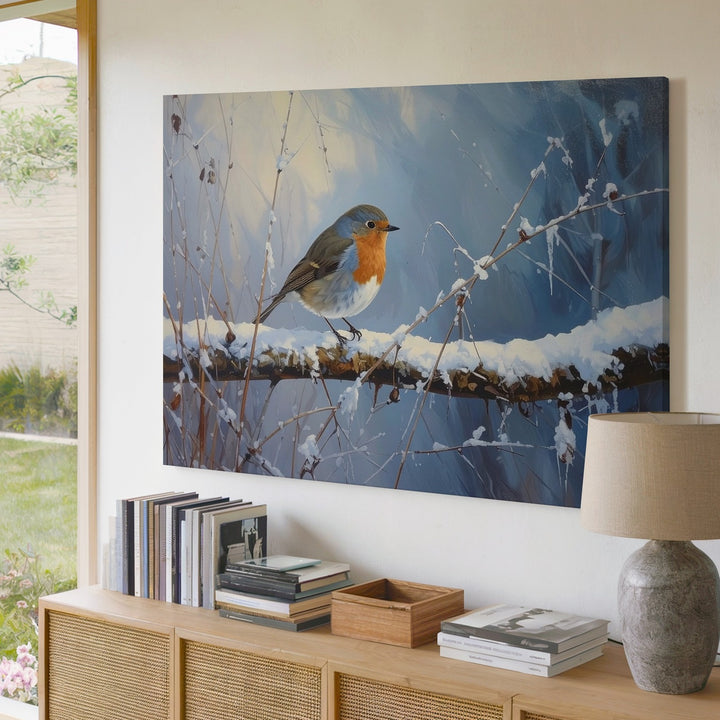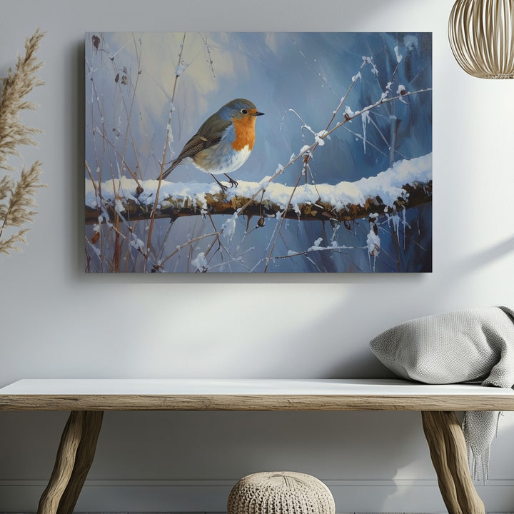 Winter Robin Canvas – Peaceful Bird on Snowy Branch Wall Art