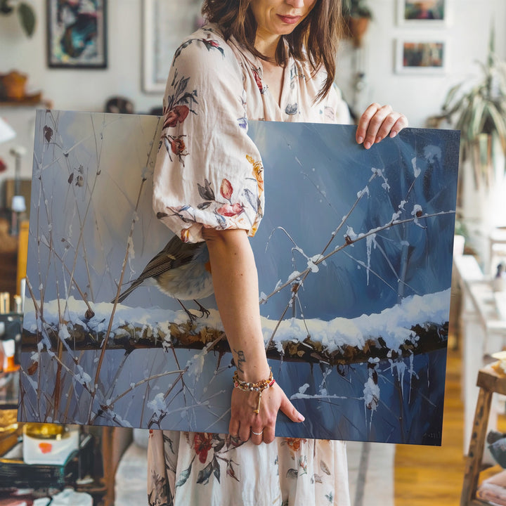 This delicate canvas captures a tender winter moment—a lone robin perched gracefully on a frost-covered branch. Its soft reddish-orange chest glows gently against the hushed blue-gray backdrop, while icy twigs shimmer around it in quiet harmony. The detailed feathers, serene posture, and natural light evoke the quiet strength of life enduring through stillness. It's a portrait of resilience, calm, and nature’s understated grace.