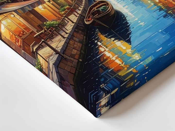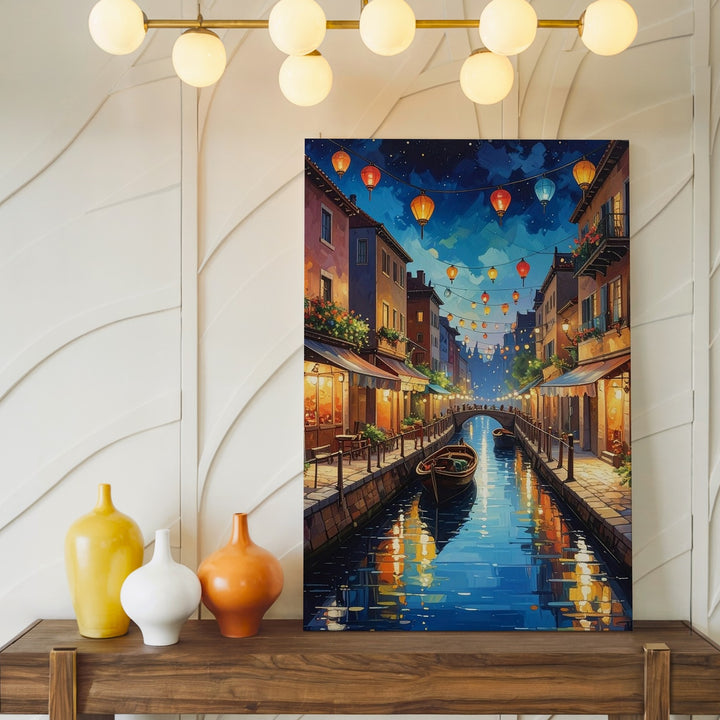 Romantic Canal Night Canvas – Impressionistic Evening Scene with Lanterns and Boat