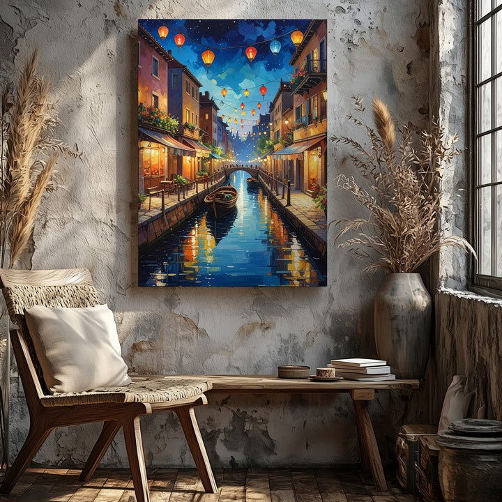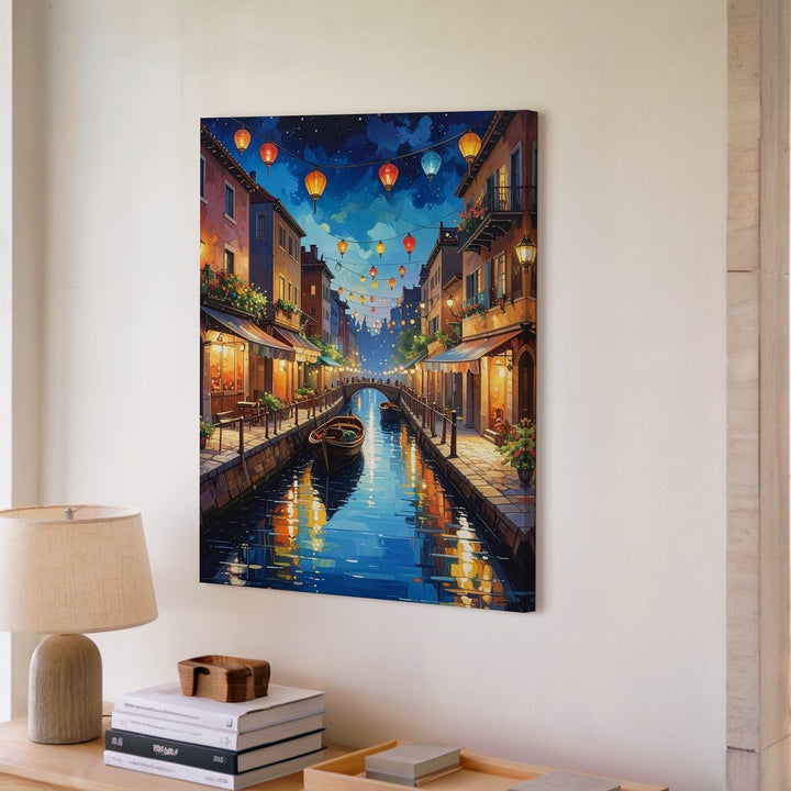 This romantic, impressionistic canvas captures a dreamy canal scene under a deep blue night sky. The warm golden glow from the windows of charming buildings lining both sides of the water adds a sense of warmth and coziness. Decorative lanterns float gently above, casting soft reflections on the tranquil canal. A small boat drifts quietly through the center, while the cobblestone walkways and balconies are rendered in delicate detail. The brushstrokes bring the scene to life, evoking a sense of movement and magic in this peaceful, picturesque setting.