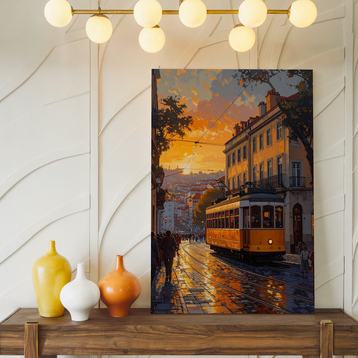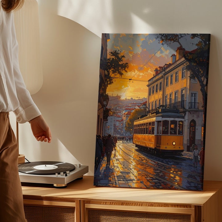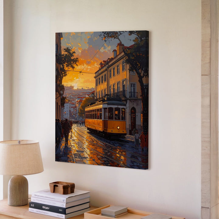 Romantic European Tram Canvas – Golden Hour Street Scene with Vintage Charm