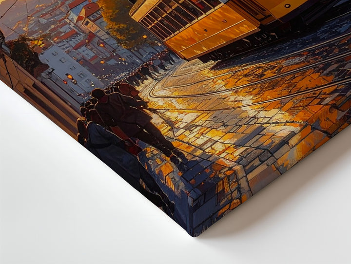 This romantic canvas captures a vintage yellow tram moving down a wet cobblestone street, bathed in the warm orange and peach hues of golden hour. The old, pastel-toned buildings with their balconies and arched windows exude timeless charm. Long shadows stretch from the trees, while the reflective pavement glows with the tram’s lights and the soft sun. People stroll along the street, depicted in soft, impressionistic strokes, enhancing the peaceful, lively atmosphere. This piece beautifully encapsulates the spirit of daily life in a historic European city.