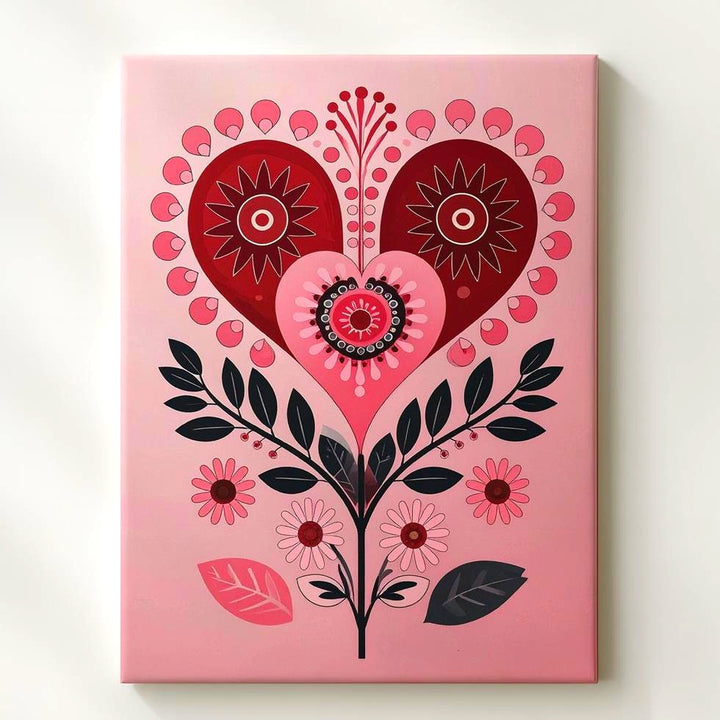 This striking folk-art heart canvas features a deep red and black heart surrounded by symmetrical floral motifs and circular flower patterns. A smaller pink heart rests at the center, adorned with the same botanical elements, creating a layered, harmonious design. Set against a soft pink background, the bold red, black, and pink palette exudes romance and celebration, while the folk-art style brings depth and traditional beauty to the piece.