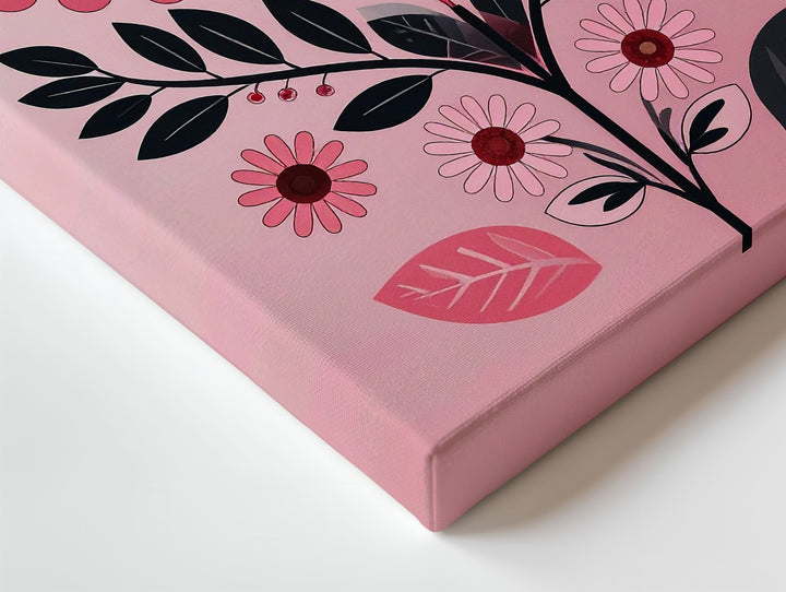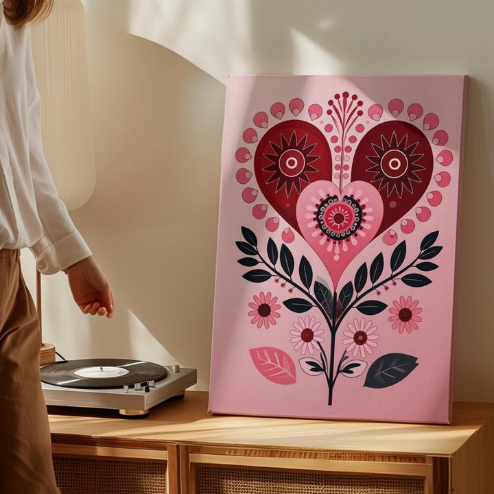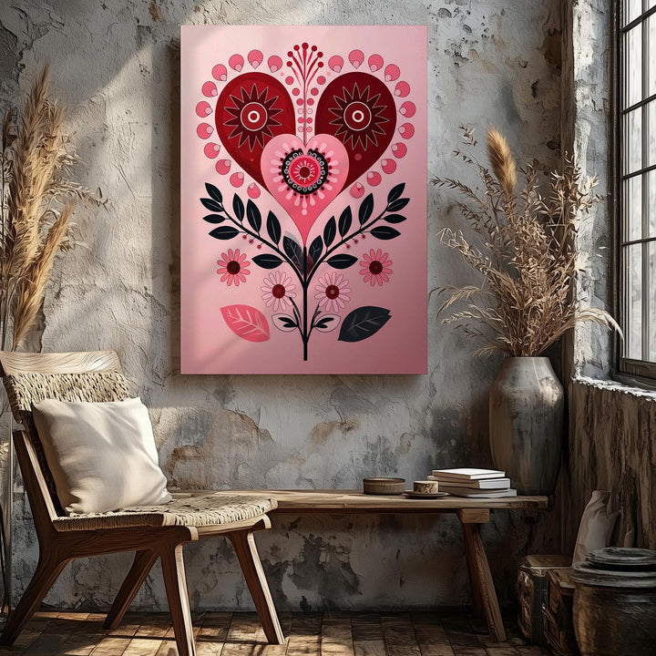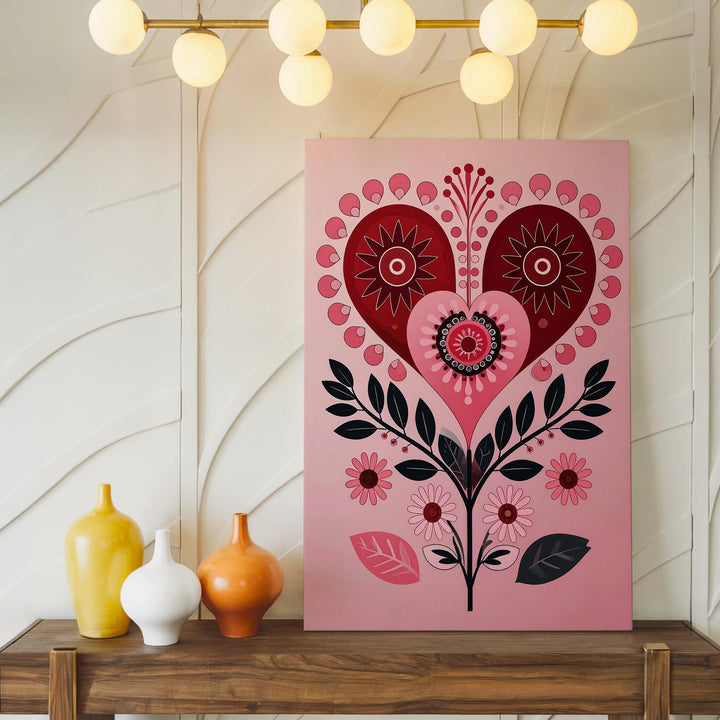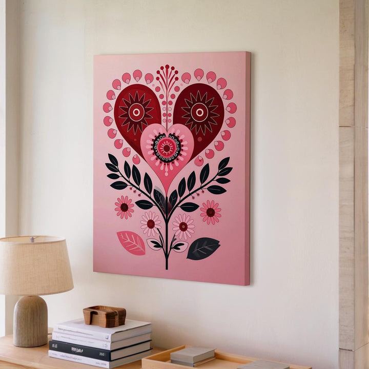 Romantic Folk Heart Canvas – Red, Black & Pink Floral Design