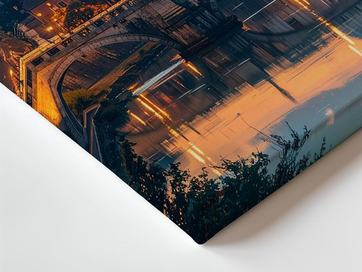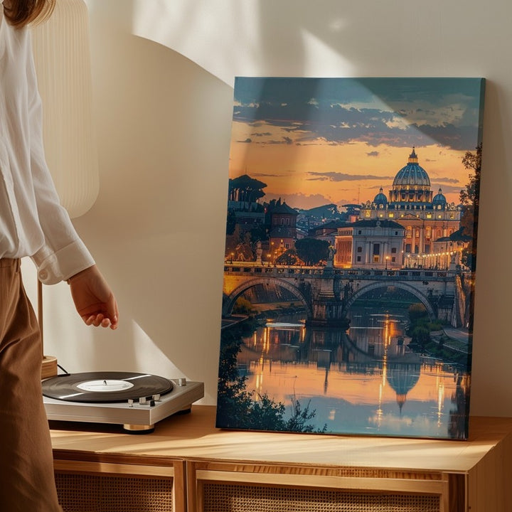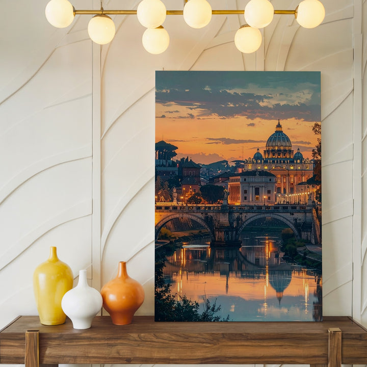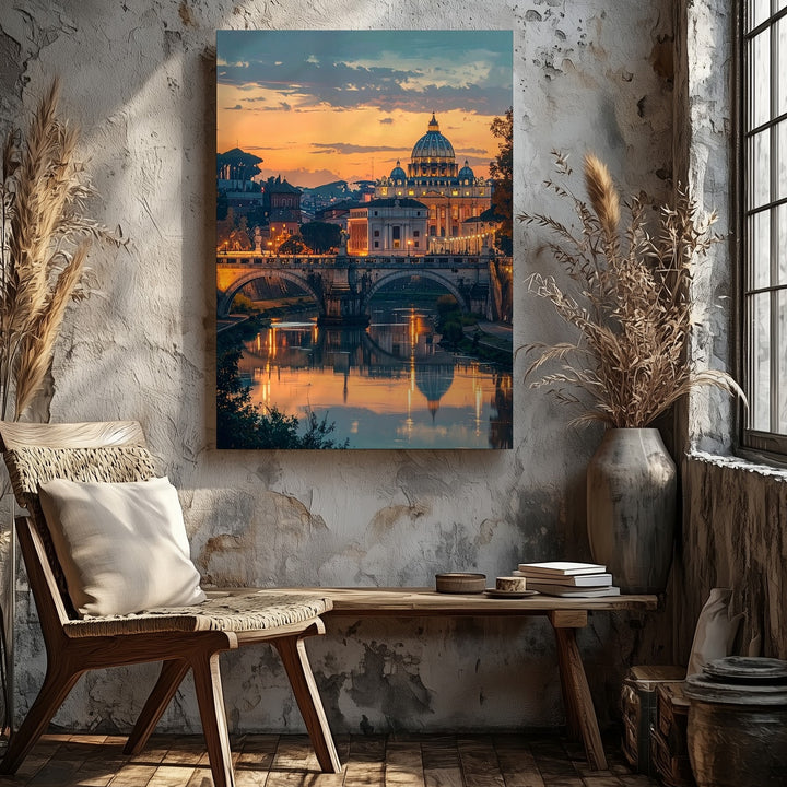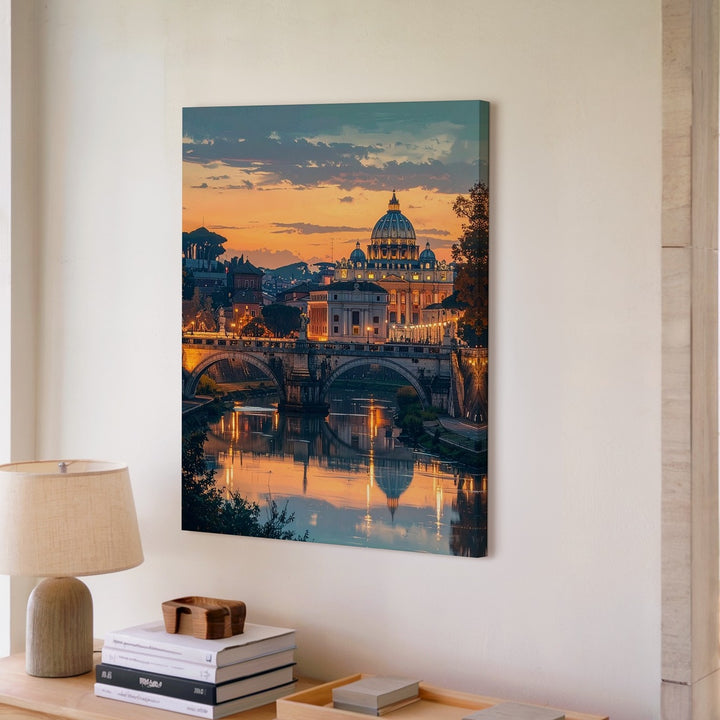 This stunning canvas portrays the romantic charm of Rome, where the golden light of sunset bathes St. Peter’s Basilica and the historic Ponte Sant'Angelo bridge. The soft reflections of the buildings shimmer in the calm Tiber River, while the tranquil sky transitions from orange to teal. Lush trees line the riverbanks, framing the scene in natural beauty. With its painterly style and atmospheric tone, this piece captures the perfect balance of architectural grandeur and serene nature, evoking the timeless allure of the Eternal City.