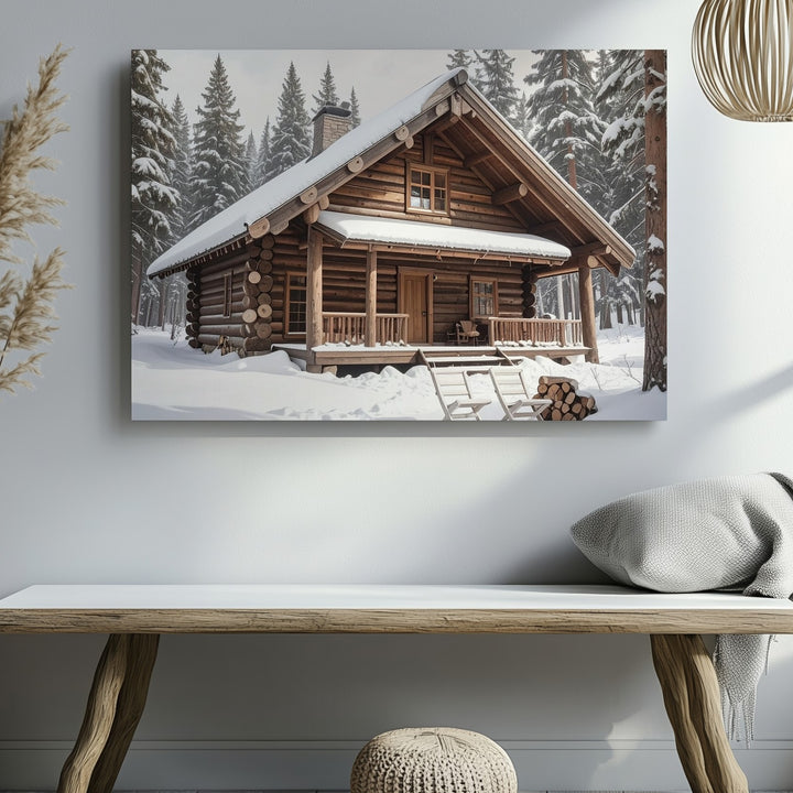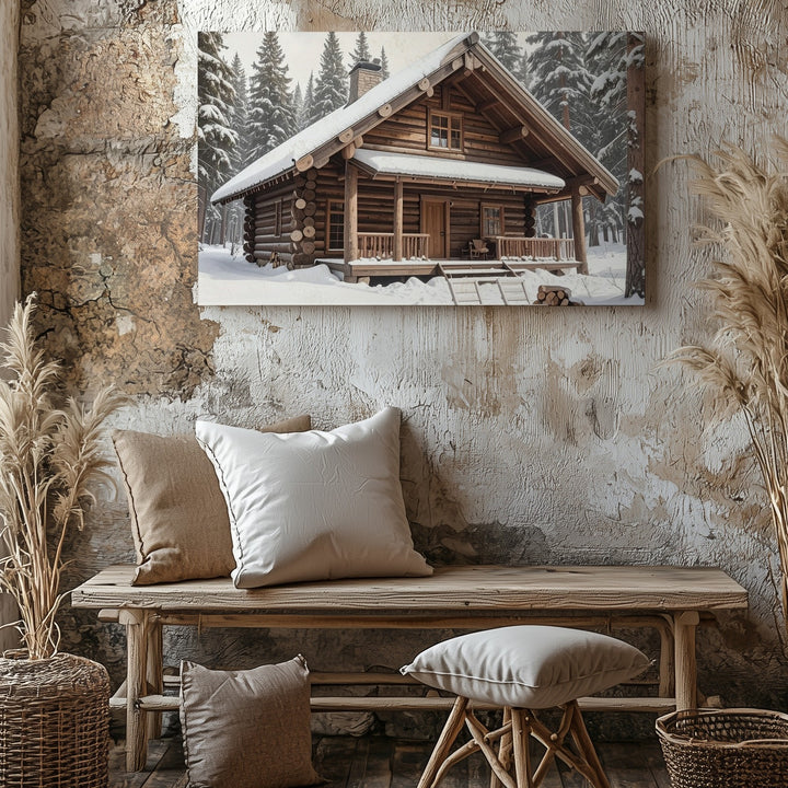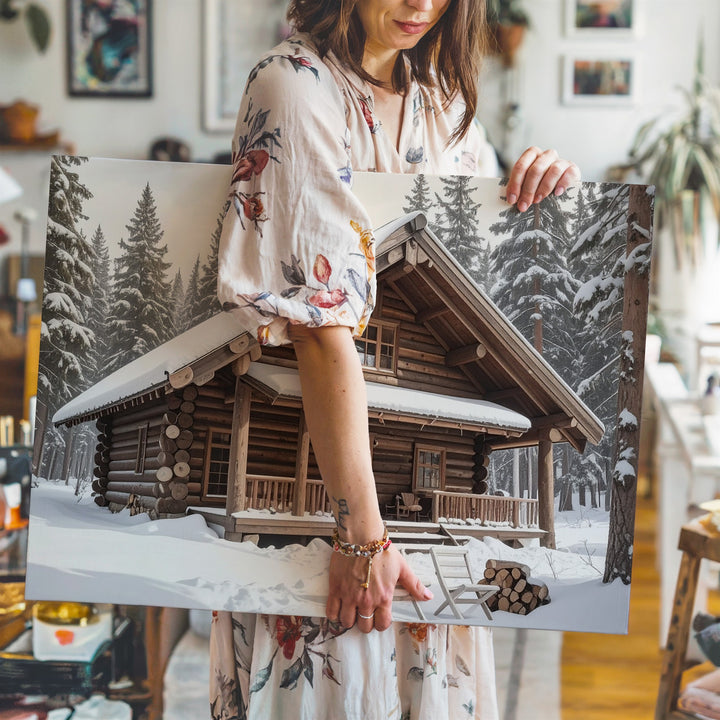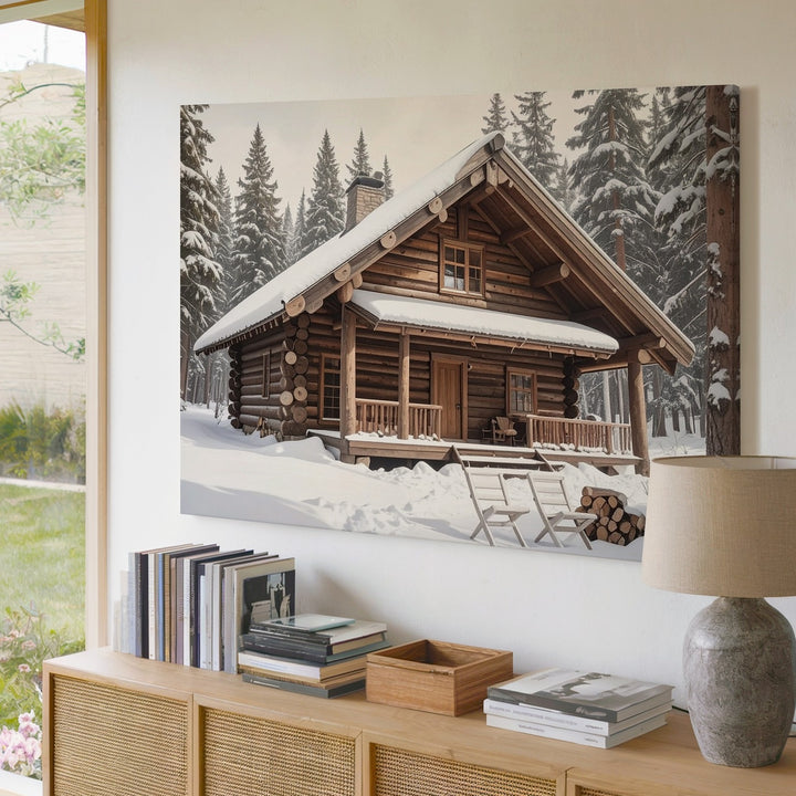 Rustic Winter Cabin Canvas – Snowy Forest Retreat Wall Art