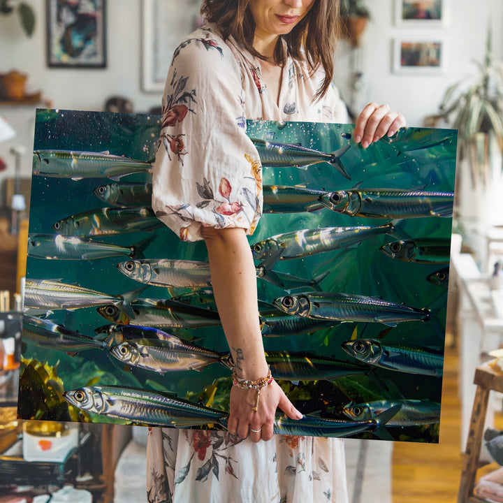 This captivating underwater canvas showcases a massive school of silver fish moving in perfect unison through crystal-clear teal waters. Their sleek bodies reflect light in rhythmic flashes of green and blue, while tiny bubbles and ripples add texture and life. A stunning tribute to the instinctual elegance of marine unity, this piece transforms movement into art and nature into meditation.