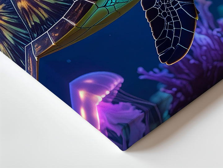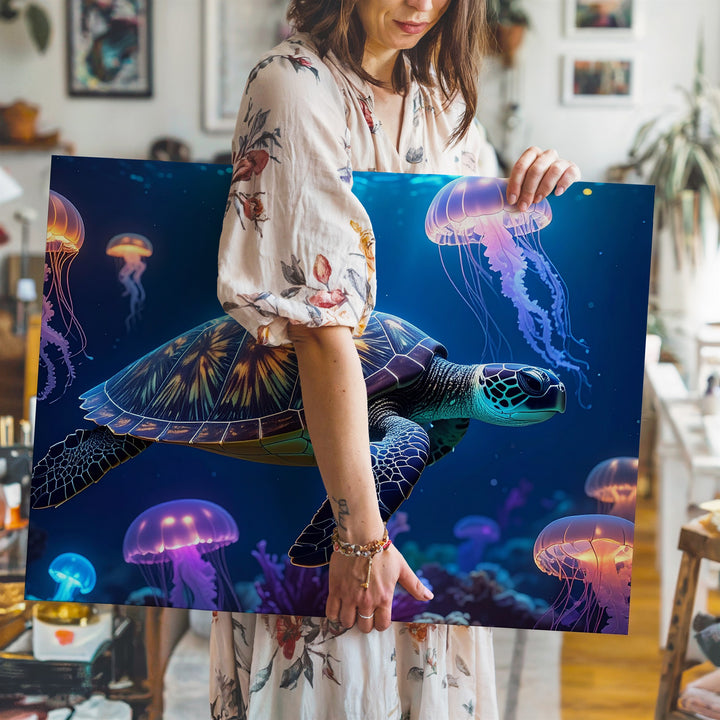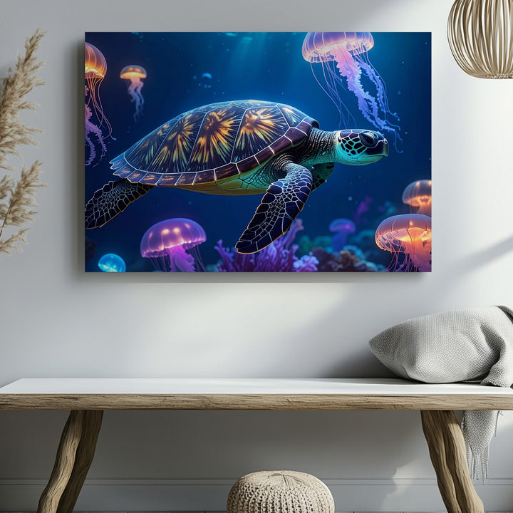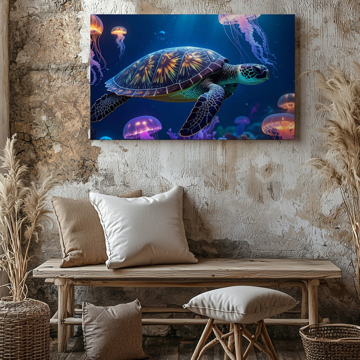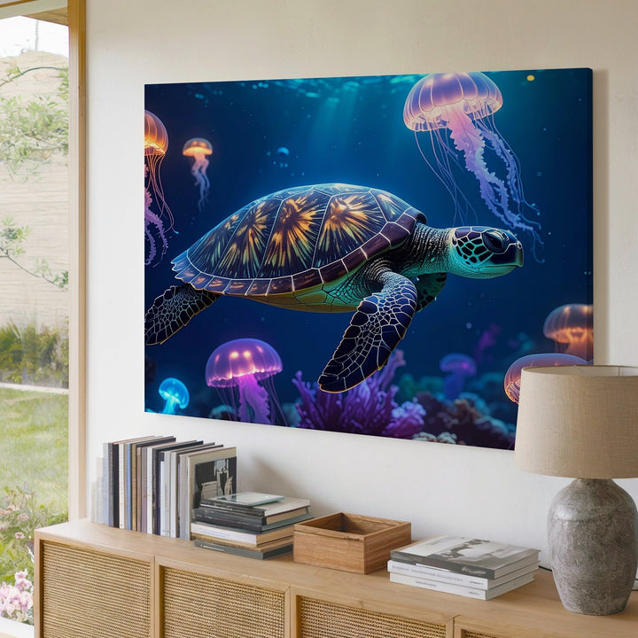 Turtle & Jellyfish Glow Canvas – Magical Bioluminescent Ocean Art