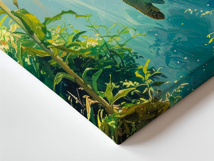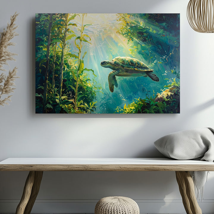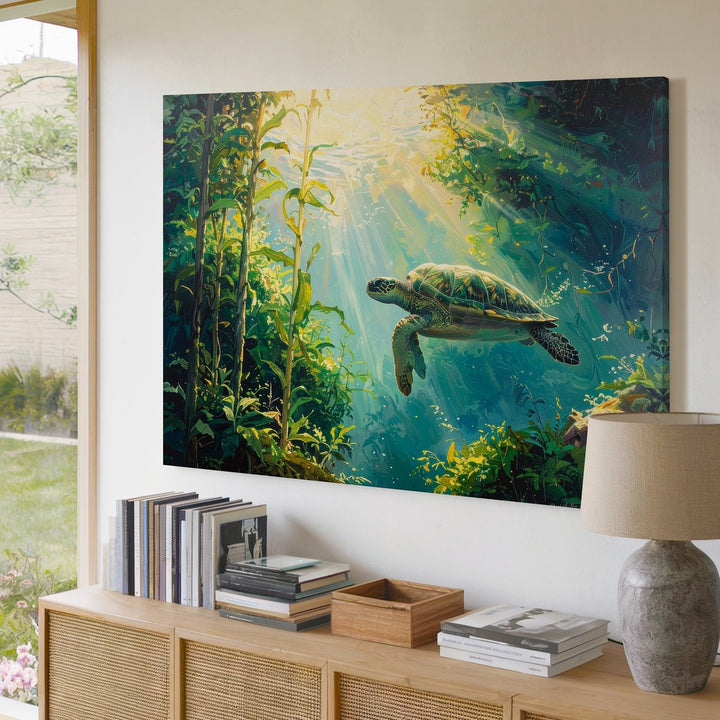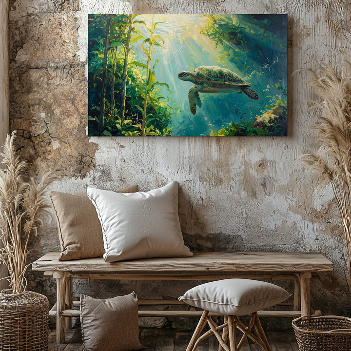 Sea Turtle in Kelp Forest Canvas – Tranquil Sunlit Underwater Scene