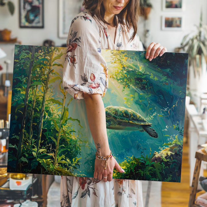 This serene canvas captures a graceful sea turtle swimming through a sun-dappled kelp forest, its outstretched flippers and glowing shell framed by towering green fronds swaying gently in the ocean current. Golden rays filter through the dense vegetation, creating layered shadows and a magical underwater glow. The scene invites calm, connection, and awe for one of nature’s most peaceful and vibrant habitats.