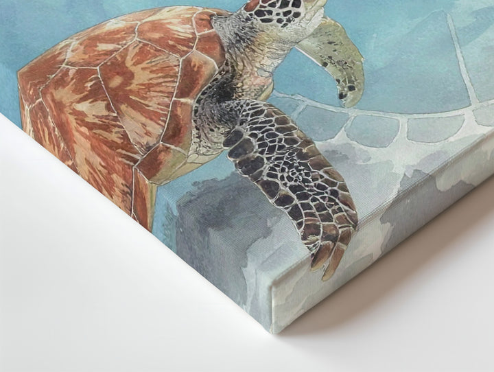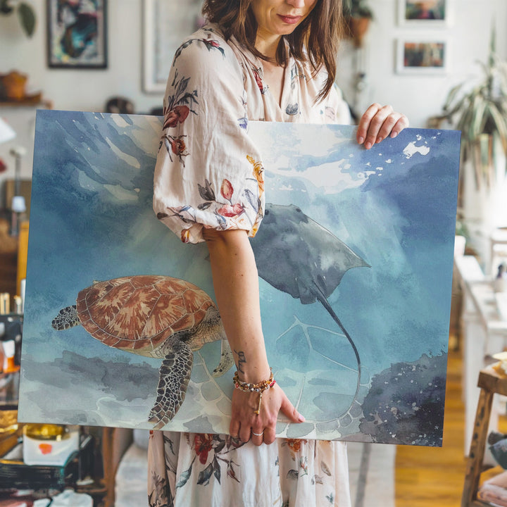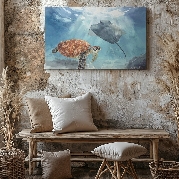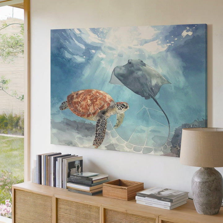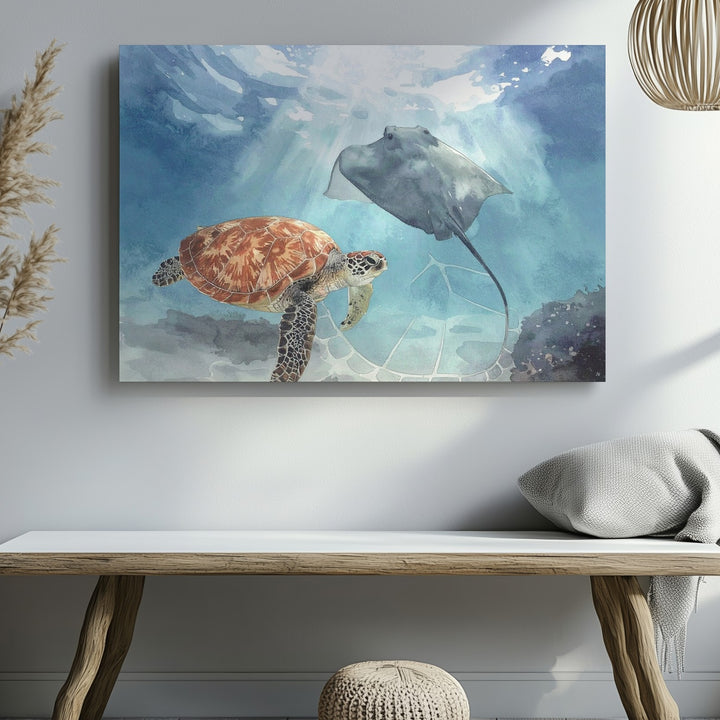 Sea Turtle & Stingray Canvas – Luminous Upward Underwater Scene