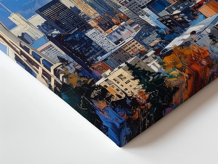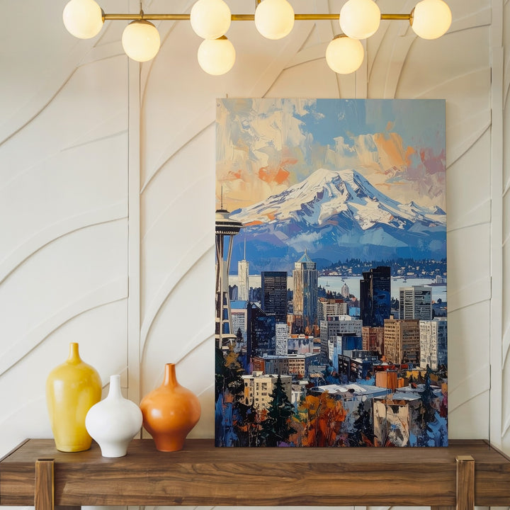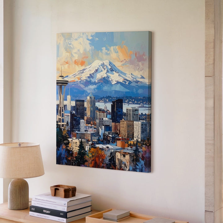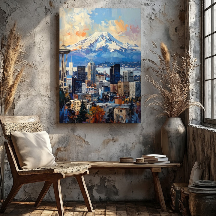 This contemporary digital painting showcases Seattle’s iconic skyline, with the Space Needle standing proudly in the foreground. Behind it, the majestic Mount Rainier rises, partially shrouded in mist, creating a striking contrast against the city. The cool grays and blues of the buildings are balanced by the soft pastel hues of the sky — a blend of peach, cream, and sky blue — evoking a peaceful, serene atmosphere. The expressive brushwork and textured strokes give the city a slightly abstract appearance while maintaining the recognizable landmarks. This piece beautifully blends urban life with the grandeur of the Pacific Northwest wilderness.