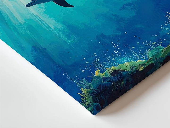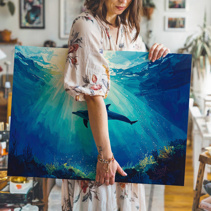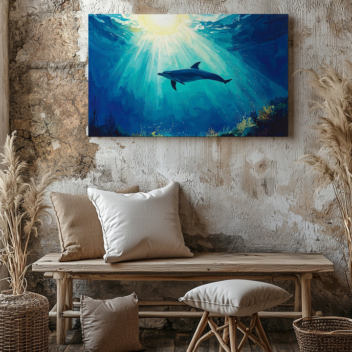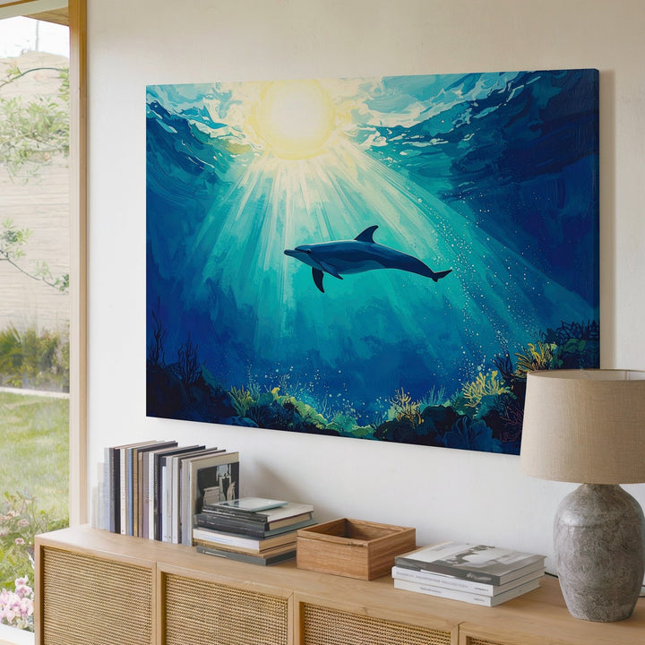 Serene Dolphin Swim Canvas – Peaceful Underwater Sunlit Art
