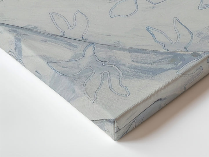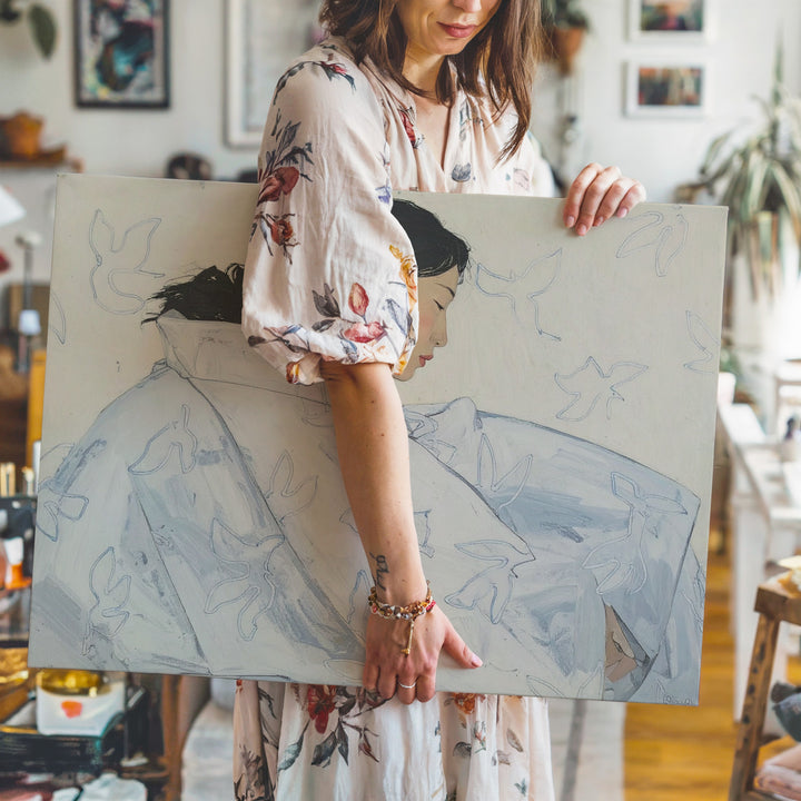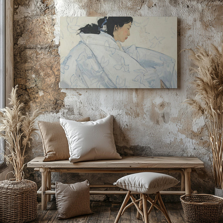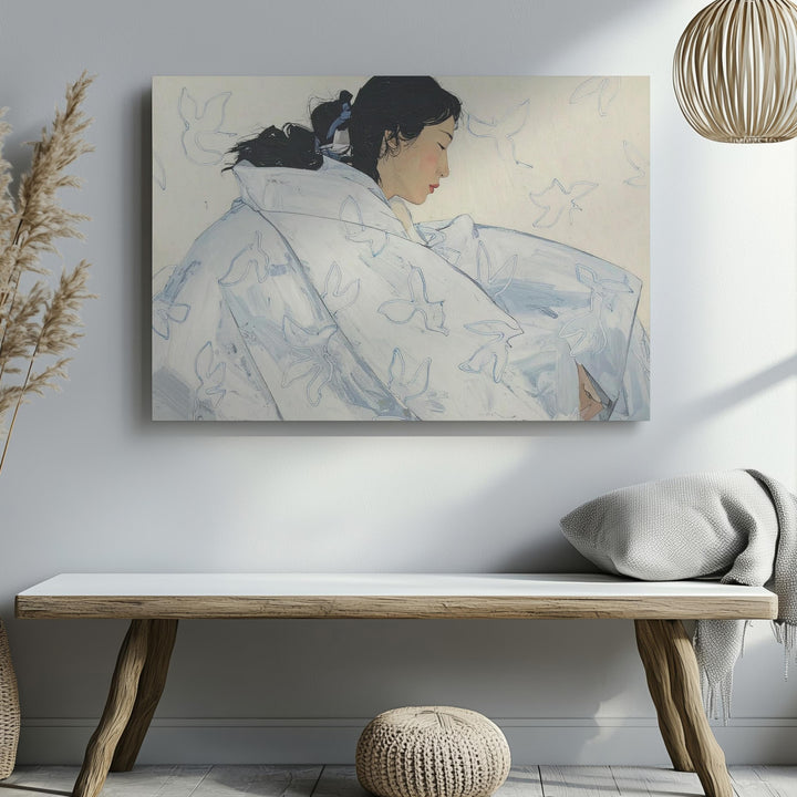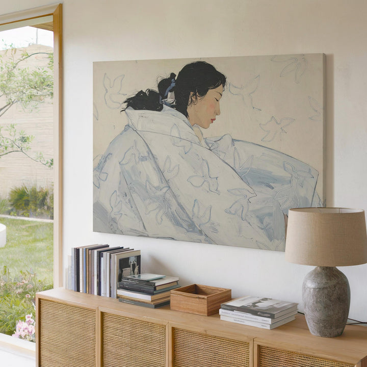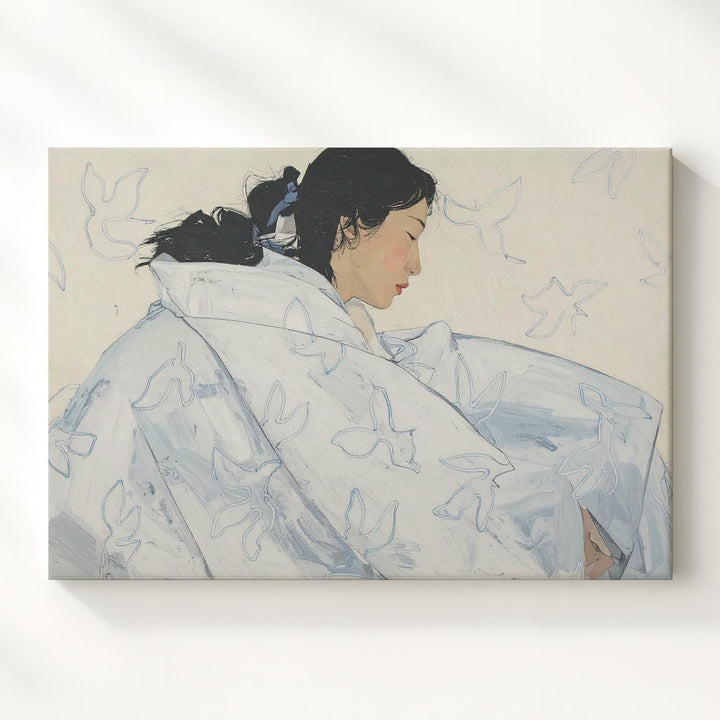 This minimalist canvas portrays a figure wrapped in an oversized white garment adorned with delicate light blue abstract bird sketches. The downward gaze and closed eyes convey introspection and calm, while soft brushwork and warm beige tones create a soothing, dreamlike atmosphere. A graceful blend of minimalism and emotion, this piece brings serene elegance to any modern interior.