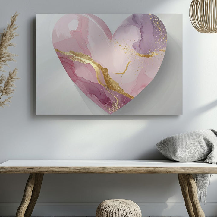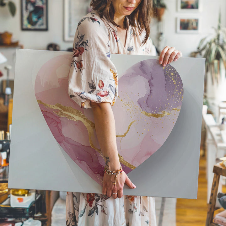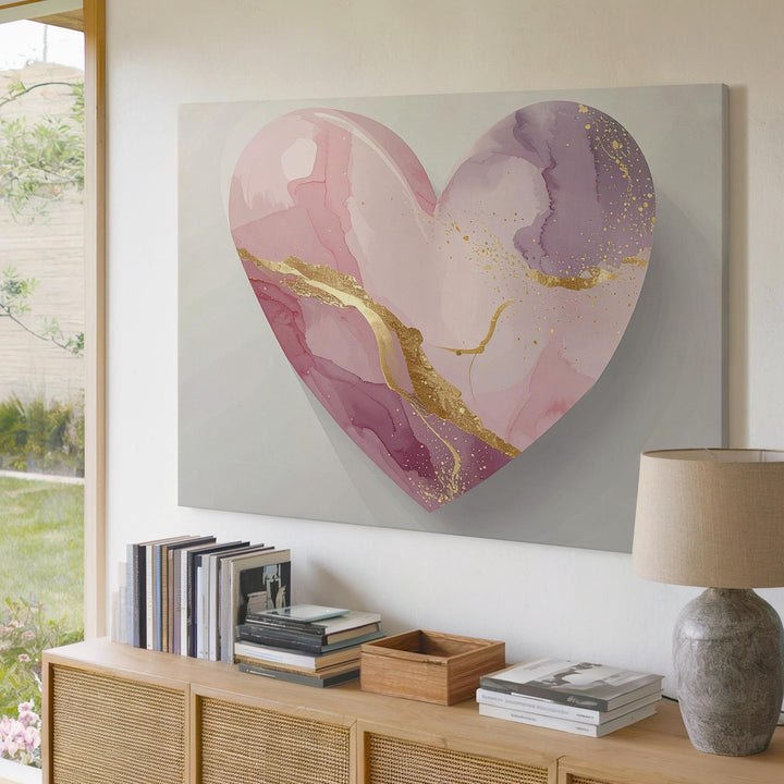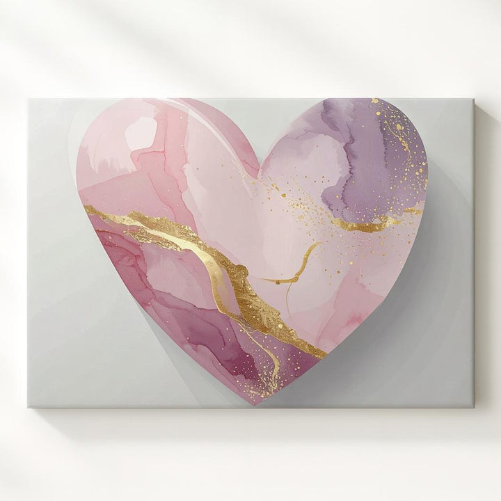 This elegant watercolor canvas captures a serene heart rendered in gentle pink and lavender hues. With golden veins running gracefully through the heart’s surface, the marbled textures lend an ethereal, luxurious feel to the design. The heart is centered on a clean white background, casting a soft shadow that enhances its delicate presence. The fluid brushwork and soft tones create an atmosphere of calm, warmth, and romantic serenity, making this piece a perfect expression of love in its most refined and gentle form.