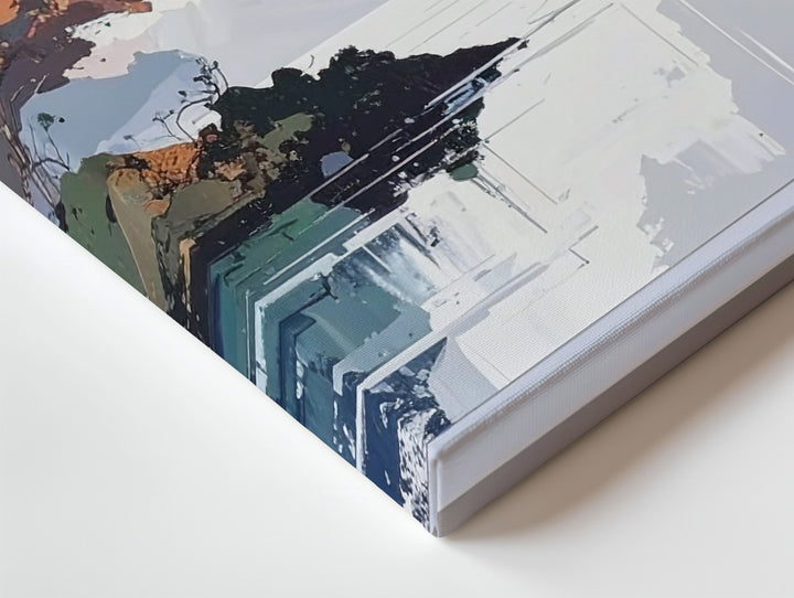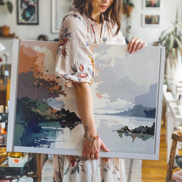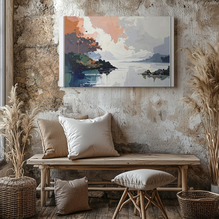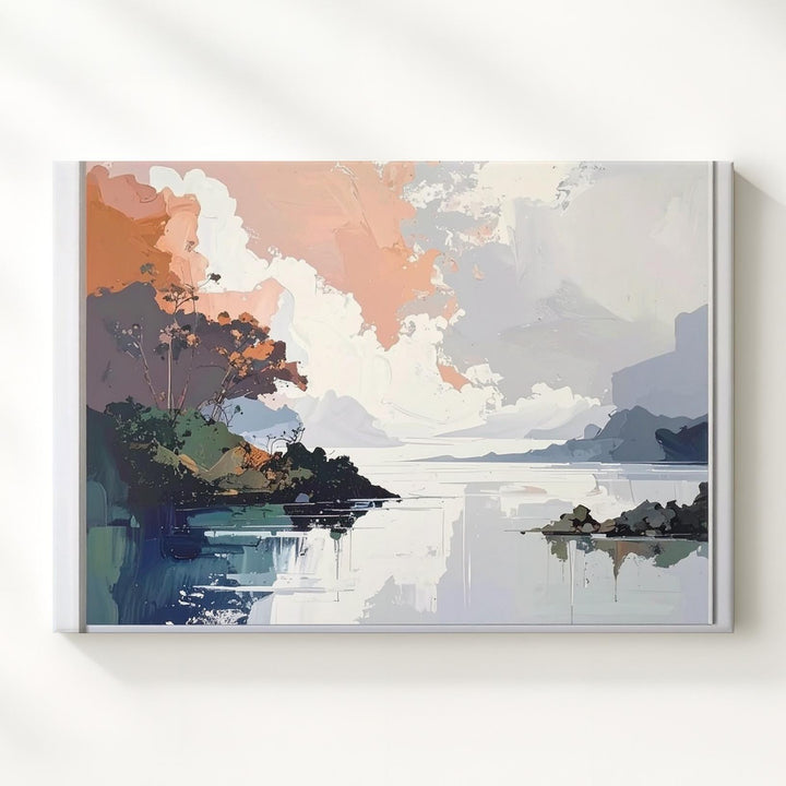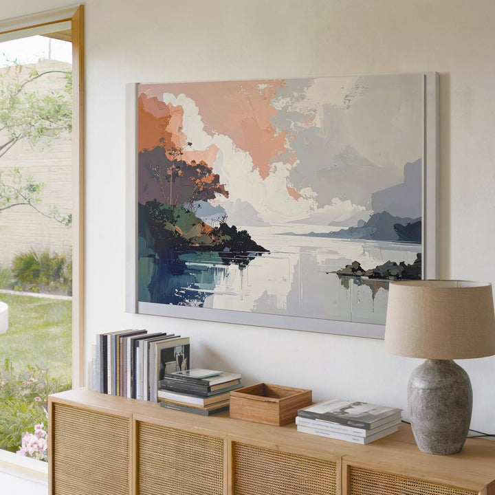 This tranquil abstract artwork gracefully blends muted tones of peach, delicate white, serene gray, and calming blues, creating an ethereal atmosphere of quiet reflection. Fluid brushwork and subtle textures evoke a gentle landscape of emotion, inviting calm contemplation and understated elegance into your space.