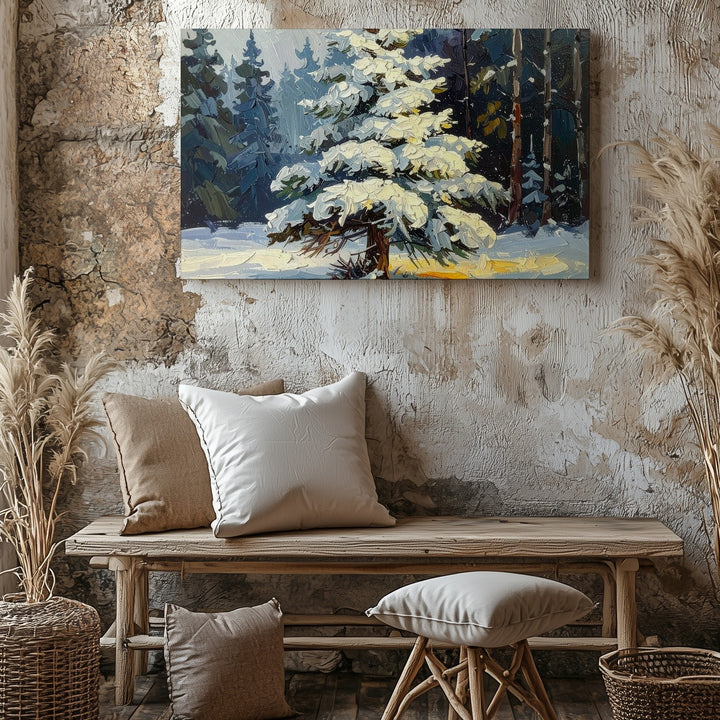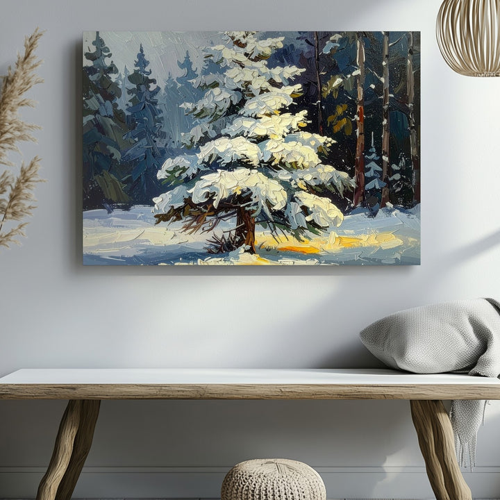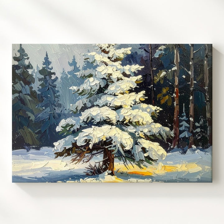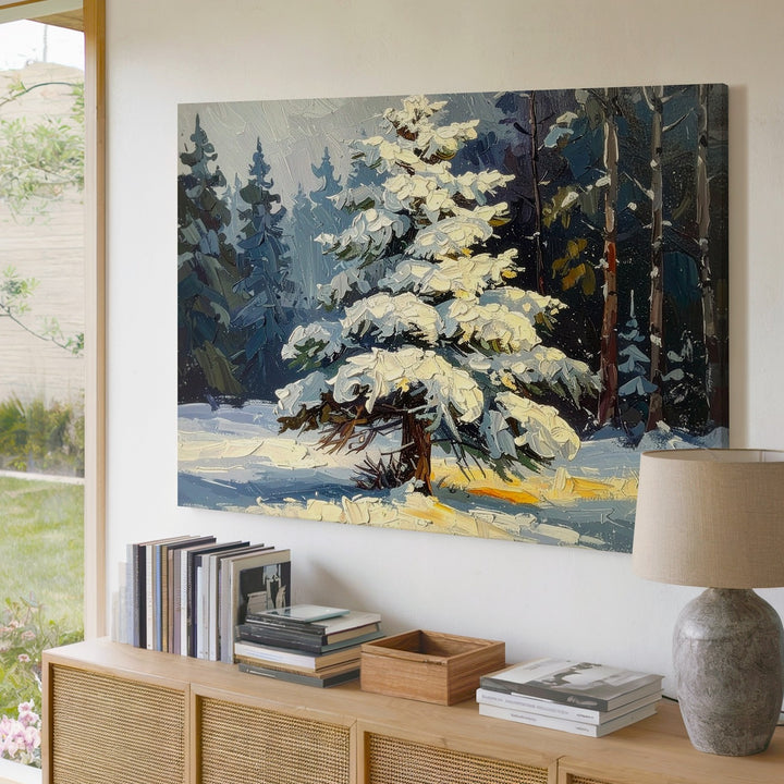Lone Snow-Laden Pine Canvas – Textured Winter Forest Tree Art