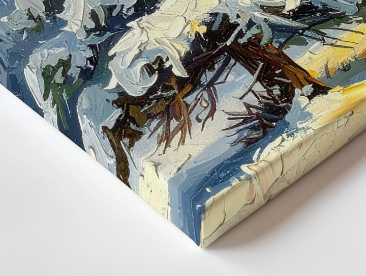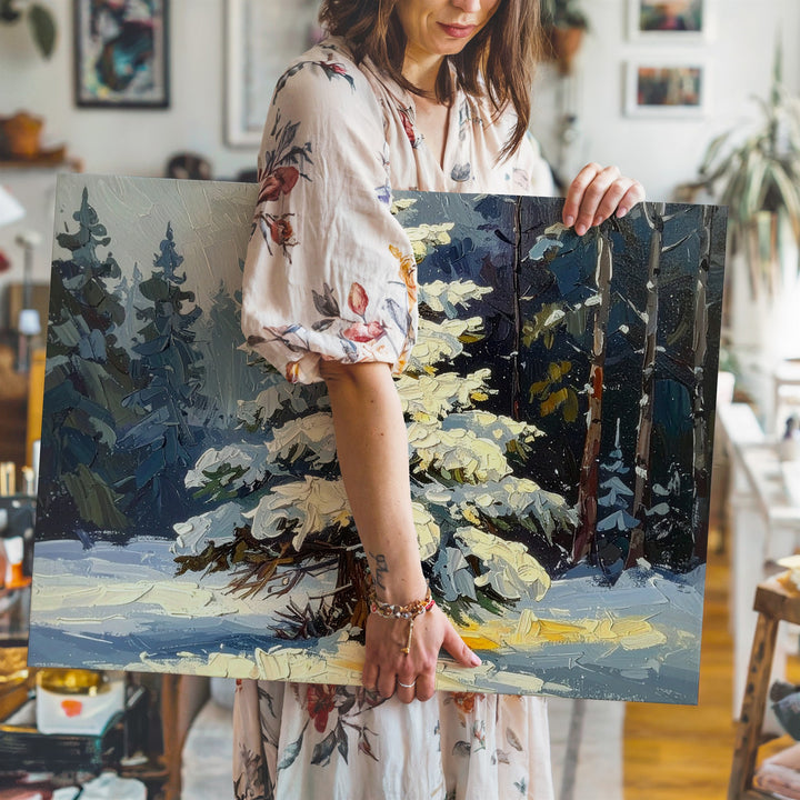 This richly textured canvas portrays a solitary pine tree blanketed in thick layers of snow, standing tall in a shadowed forest clearing. Bold brushstrokes bring the weight and softness of winter to life, while warm yellow highlights peek through the snow, adding glow to the serene palette of whites and deep woodland hues. Framed by tall dark trunks and vertical shadows, the tree becomes a symbol of resilience—calm, enduring, and quietly luminous.