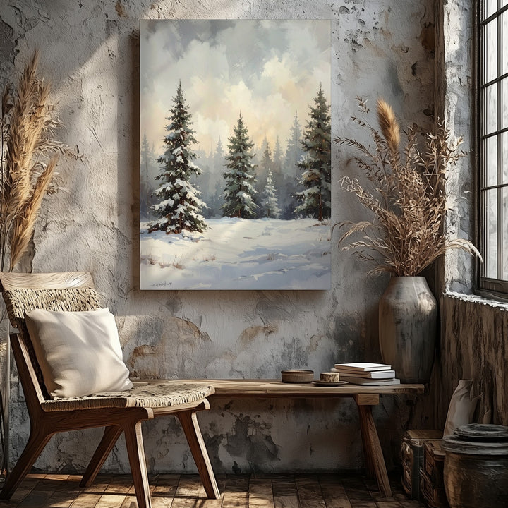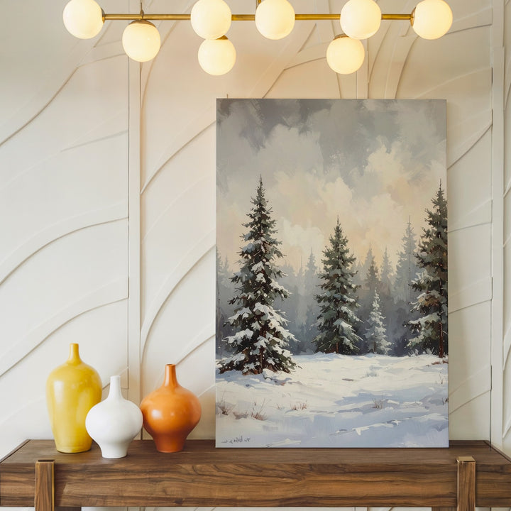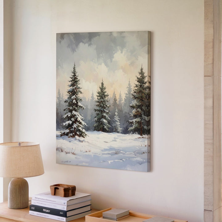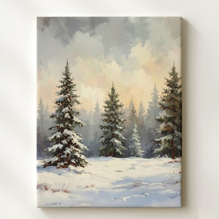 This soft, atmospheric canvas captures a line of evergreen trees standing evenly across a snowy field beneath a dreamy, cloudy sky. Heavy snow blankets their branches, gently bending them under nature’s calm. Warm gray and cream gradients in the background lend a vintage, painterly glow, while the untouched snow invites peaceful solitude and reflective winter calm.