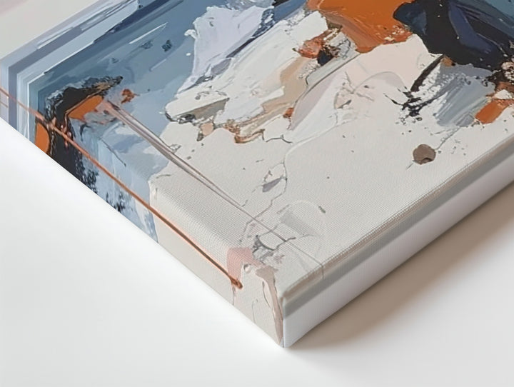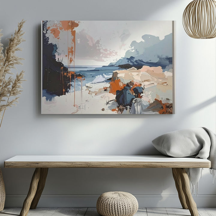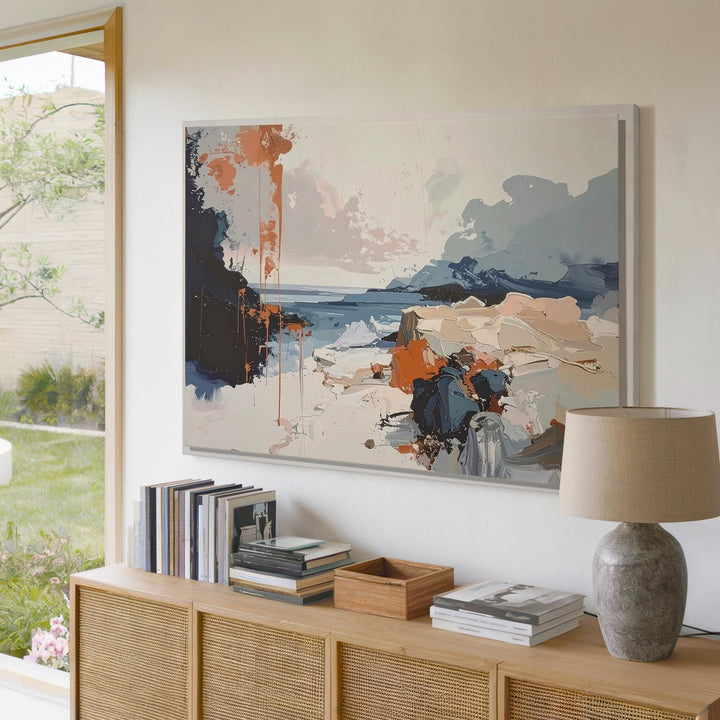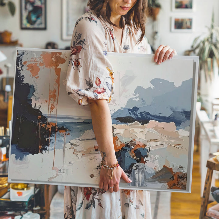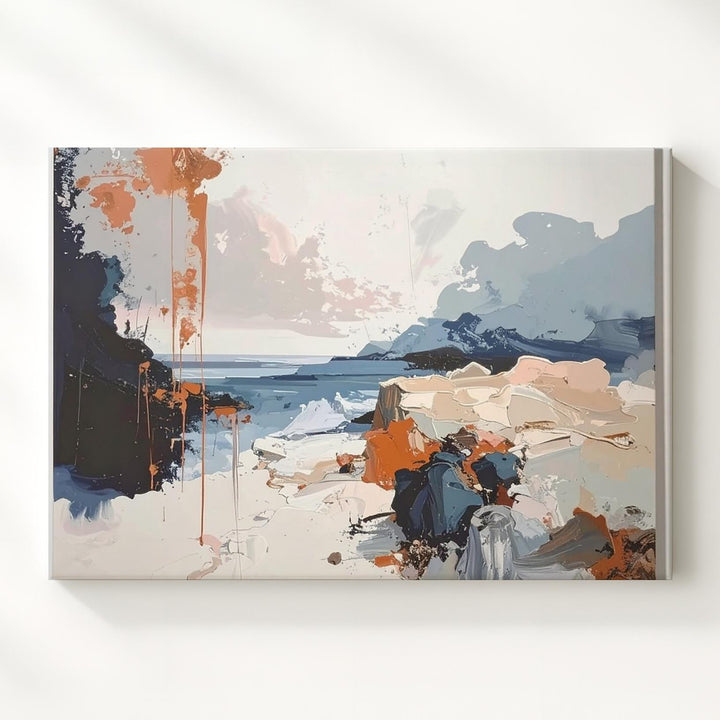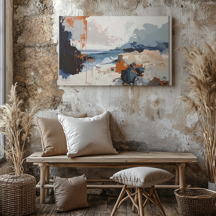 This atmospheric abstract canvas gently blends cool navy blues, pale peaches, soft terracotta, and serene off-whites, creating a tranquil, fluid landscape that speaks softly yet profoundly. With subtle textures and organic transitions reminiscent of distant horizons or natural formations, it offers a peaceful, introspective ambiance—perfectly balancing warmth and coolness in harmonious unity.