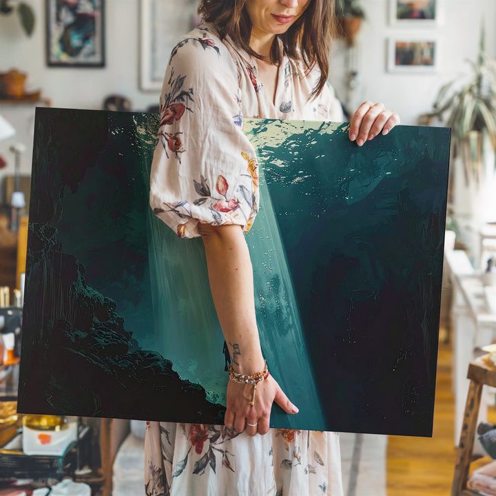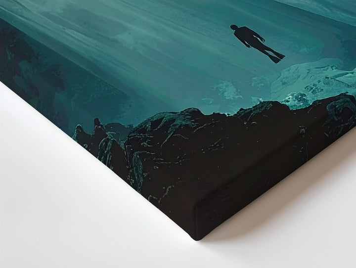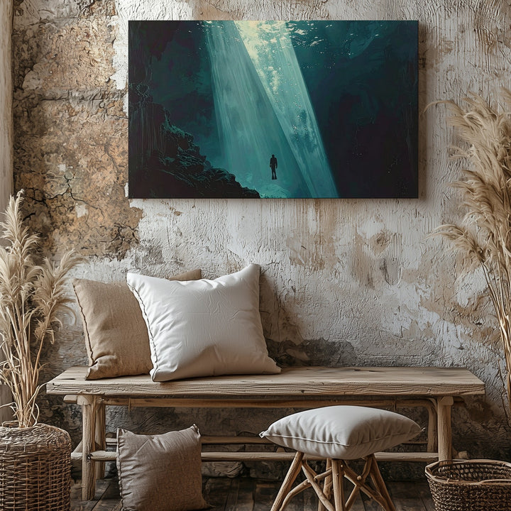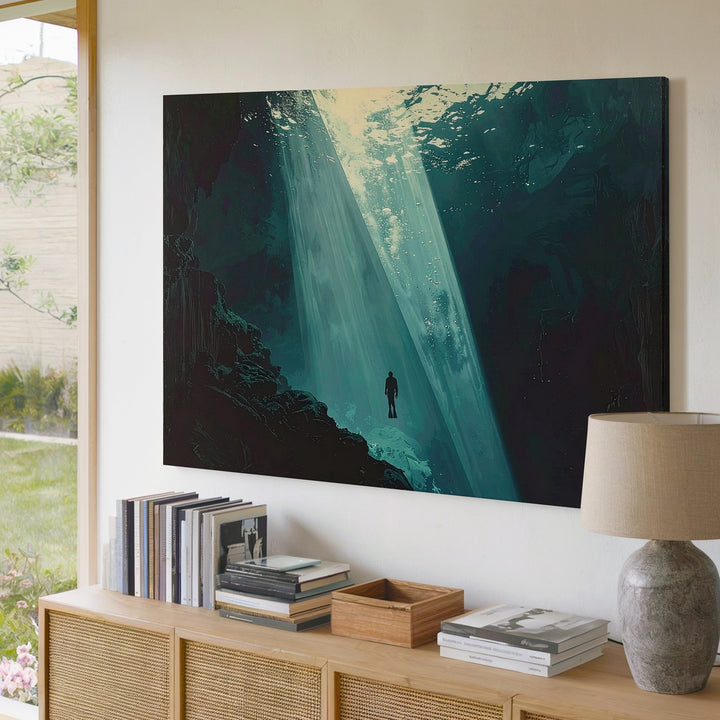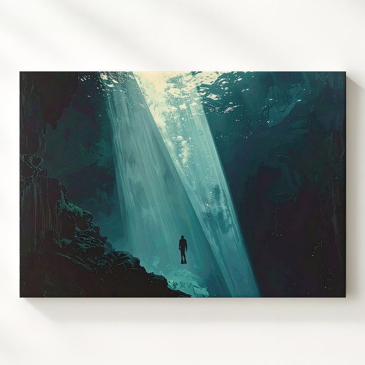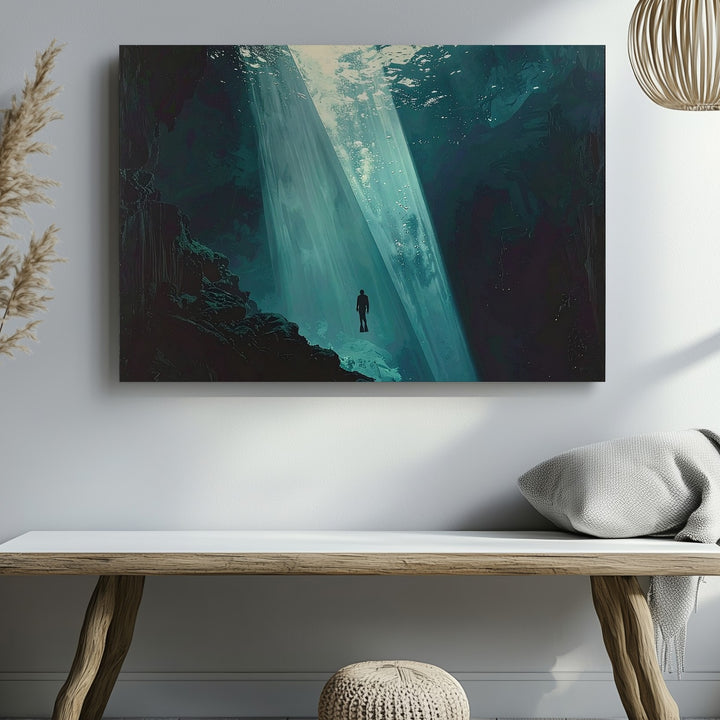 Solitary Descent Canvas – Diver in Beam of Light Under Deep Ocean
