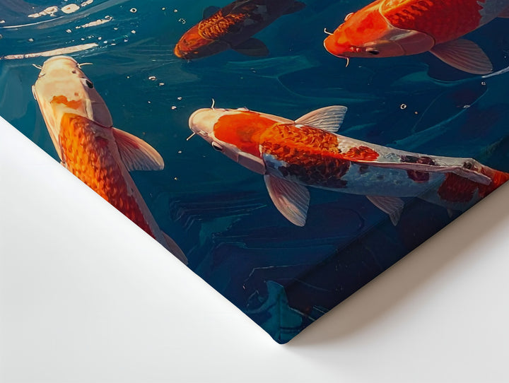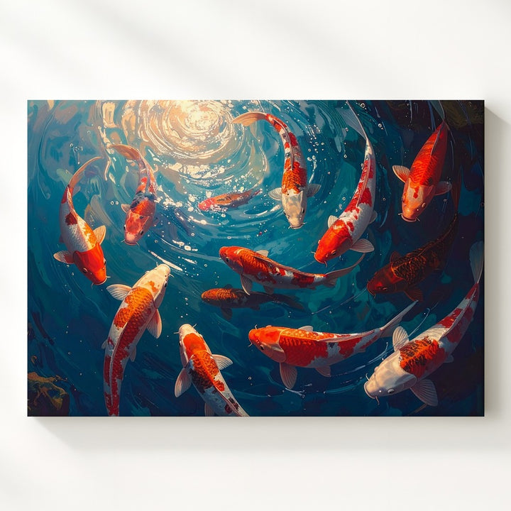 This vibrant canvas captures a mesmerizing underwater scene viewed from below, where sunlight filters through rippling water onto a swirling school of koi fish. Brilliant reds, oranges, and whites dance in a dynamic spiral against deep blue waters. Detailed scales, flowing fins, and rising bubbles create a dreamlike, magical atmosphere—inviting you to dive into nature’s elegant rhythm and harmony.