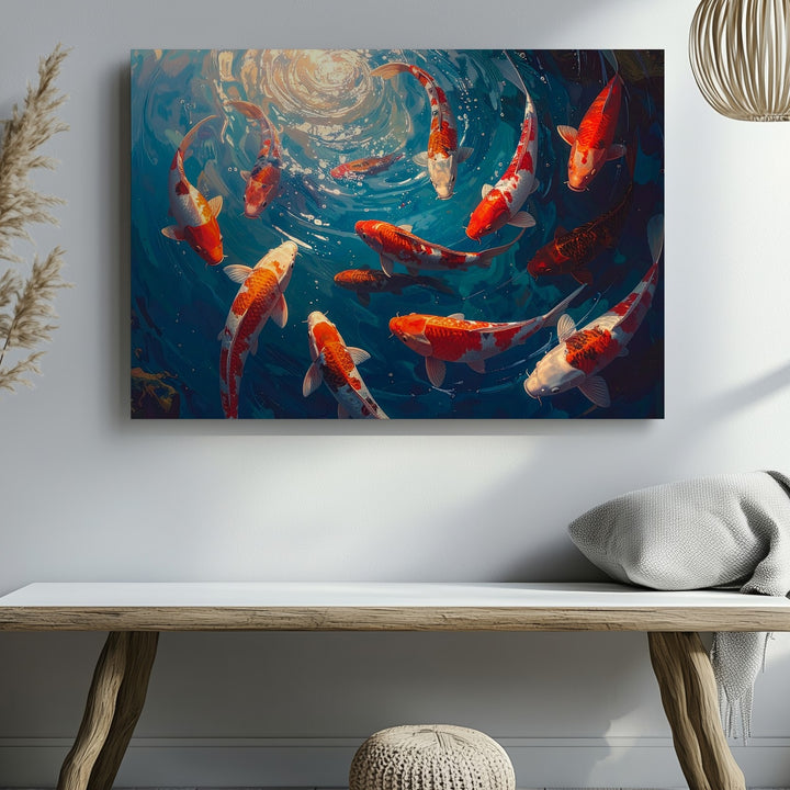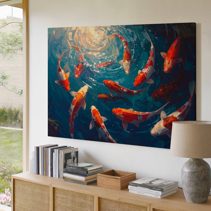 Spiral Koi School Canvas – Vibrant Underwater Sunlit Art