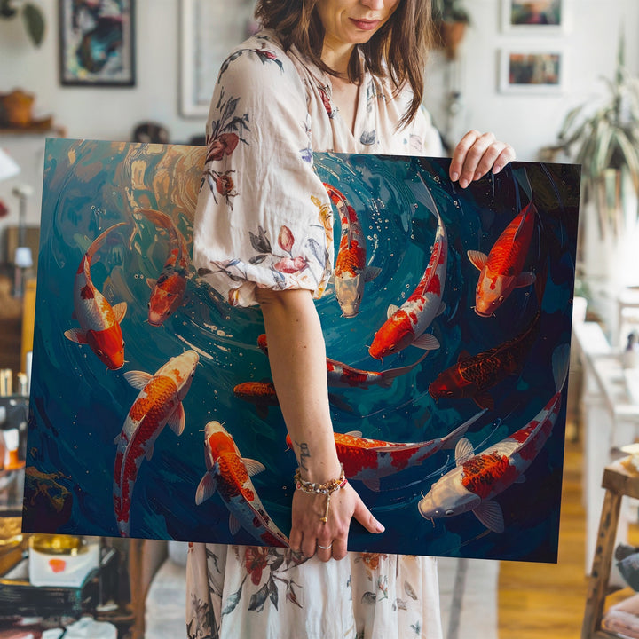 * Dynamic Motion: Swirling koi fish form a captivating spiral full of life and energy.
