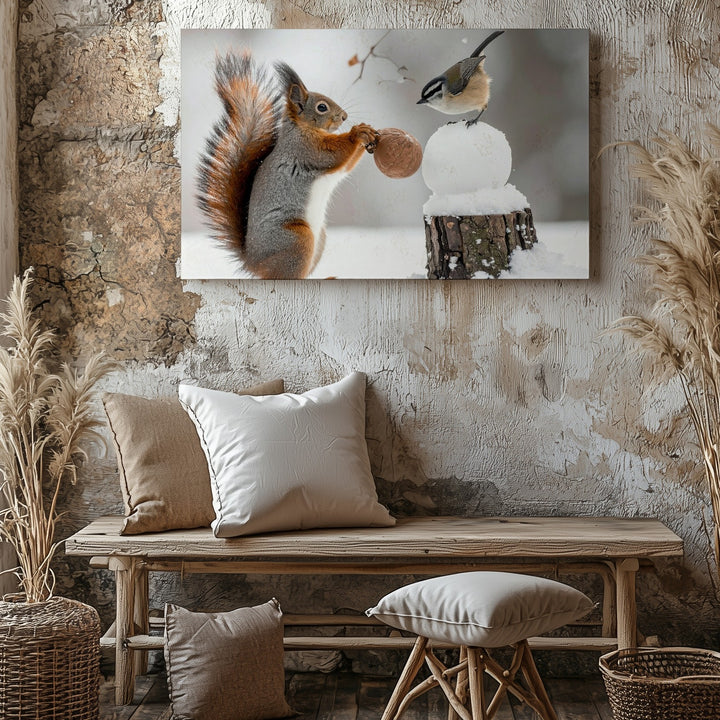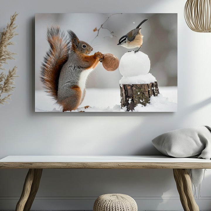 Snowball Encounter Canvas – Whimsical Squirrel & Bird Winter Scene